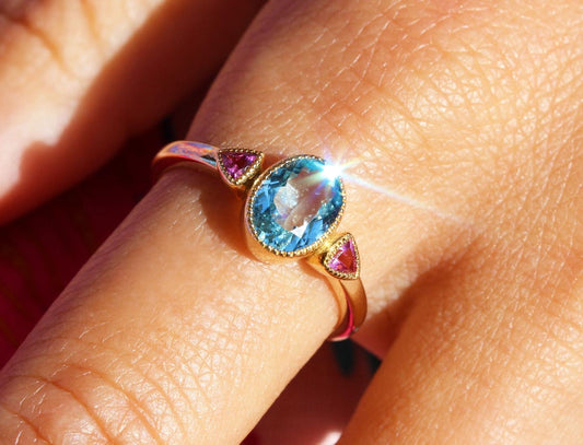 Aquamarine & Pink Tourmaline Milgrain Bezel Ring in 14K Yellow Gold