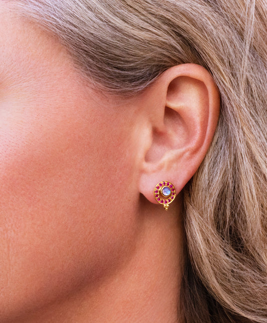 Celestial Moonstone & Ruby Stud Earrings in 14K Yellow Gold