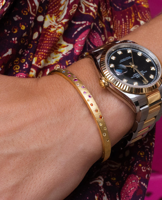 Scattered Rainbow Sapphire Hinged Bangle Bracelet in 14K Yellow Gold