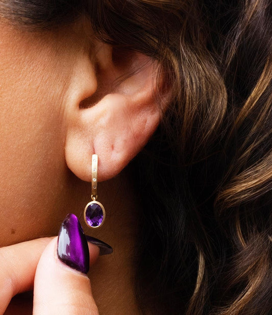 Amethyst & Diamond Dangle Huggie Earrings in 14K Yellow Gold
