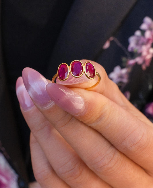 Three Stone Ruby Bezel Ring in 18K Yellow Gold