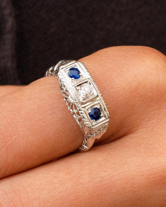 Art Deco Sapphire & Diamond Filigree Trilogy Ring in 14K White Gold