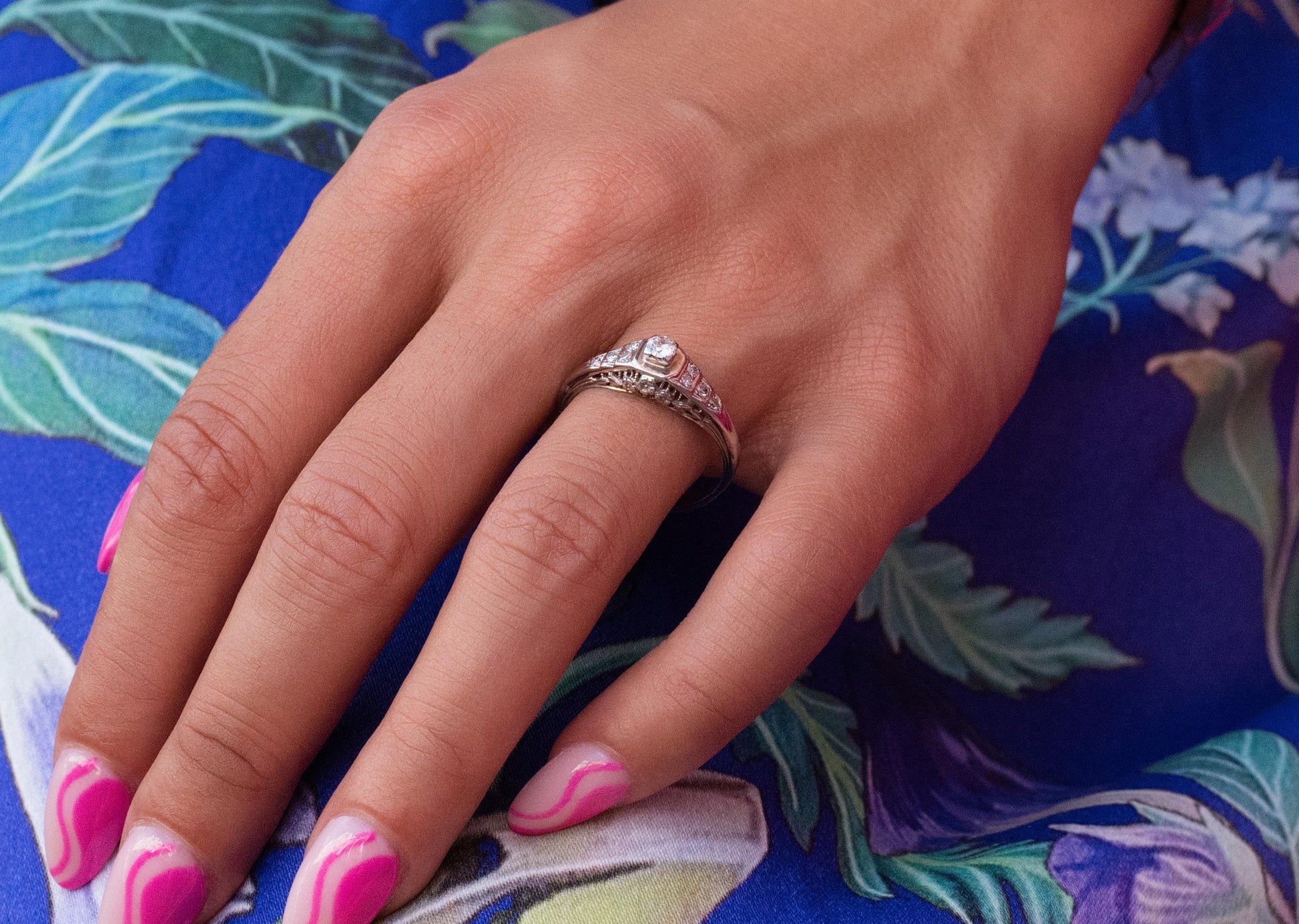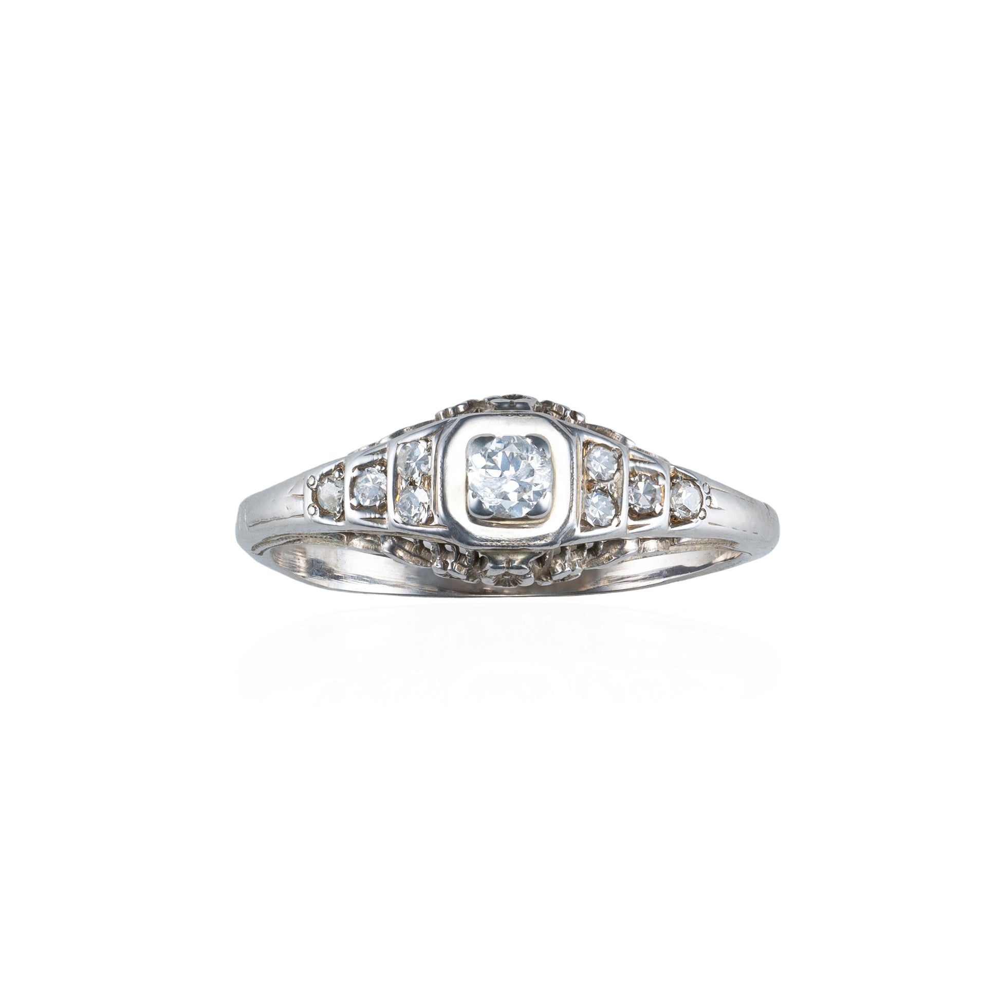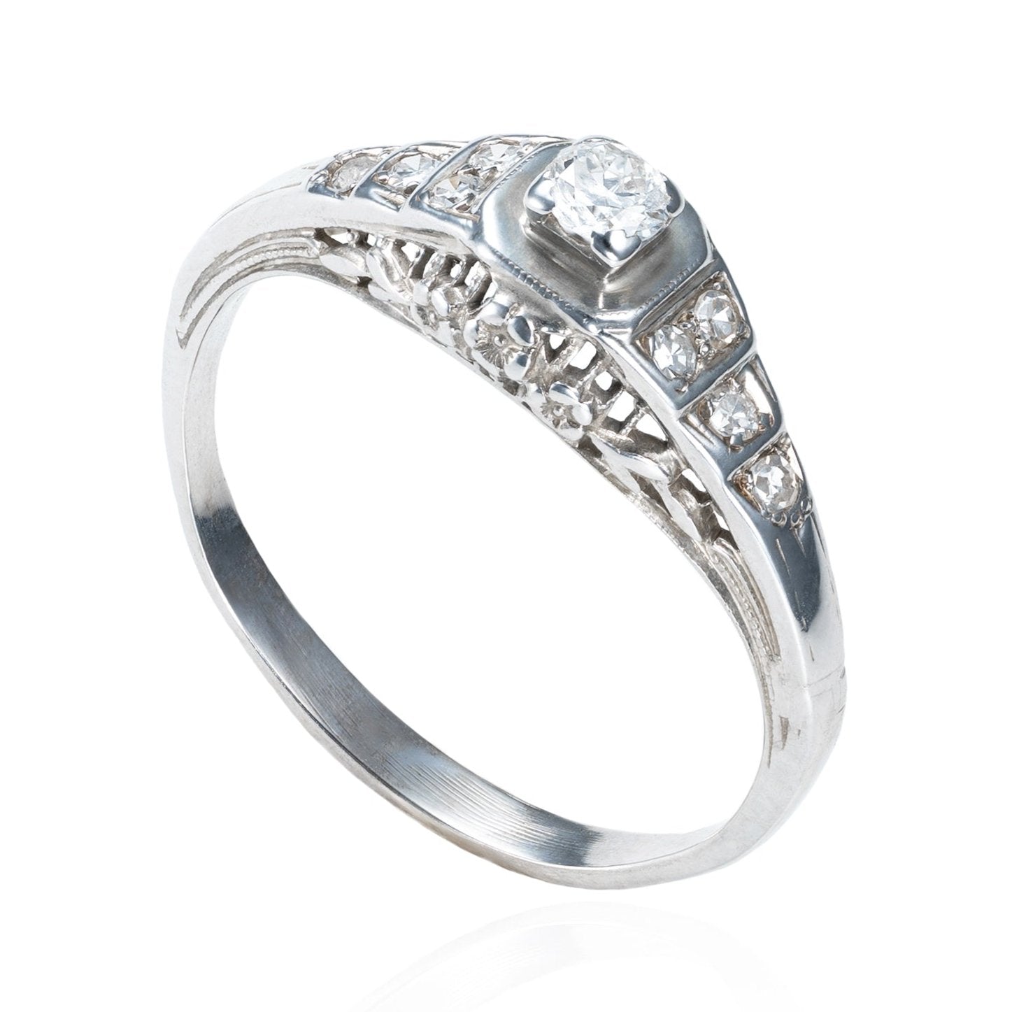 Authentic, antique Art Deco diamond filigree ring crafted in 14K white gold. This ring is solid and sturdy, unlike more delicate rings of the time. It features .18 ctw of natural diamonds. Gorgeous floral detailing can be found on the sides of the ring, as well as a traditional ‘Art Deco‘ stepped motif on the shoulders. This beautiful antique would make a terrific engagement or promise ring.