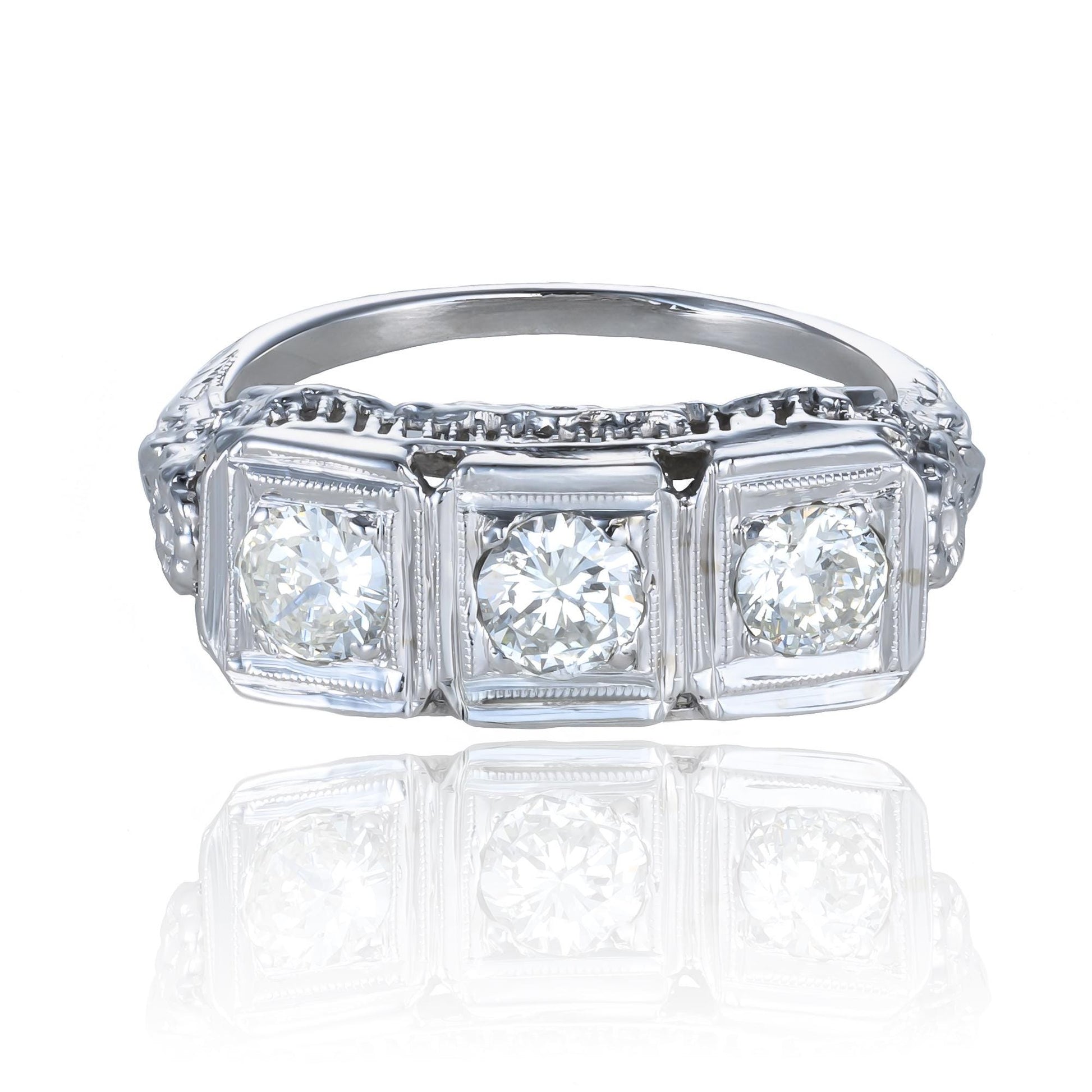 The three stone style of this Deco ring is known as a trilogy ring. Trilogy rings have three primary stones which represent the past, present and future.