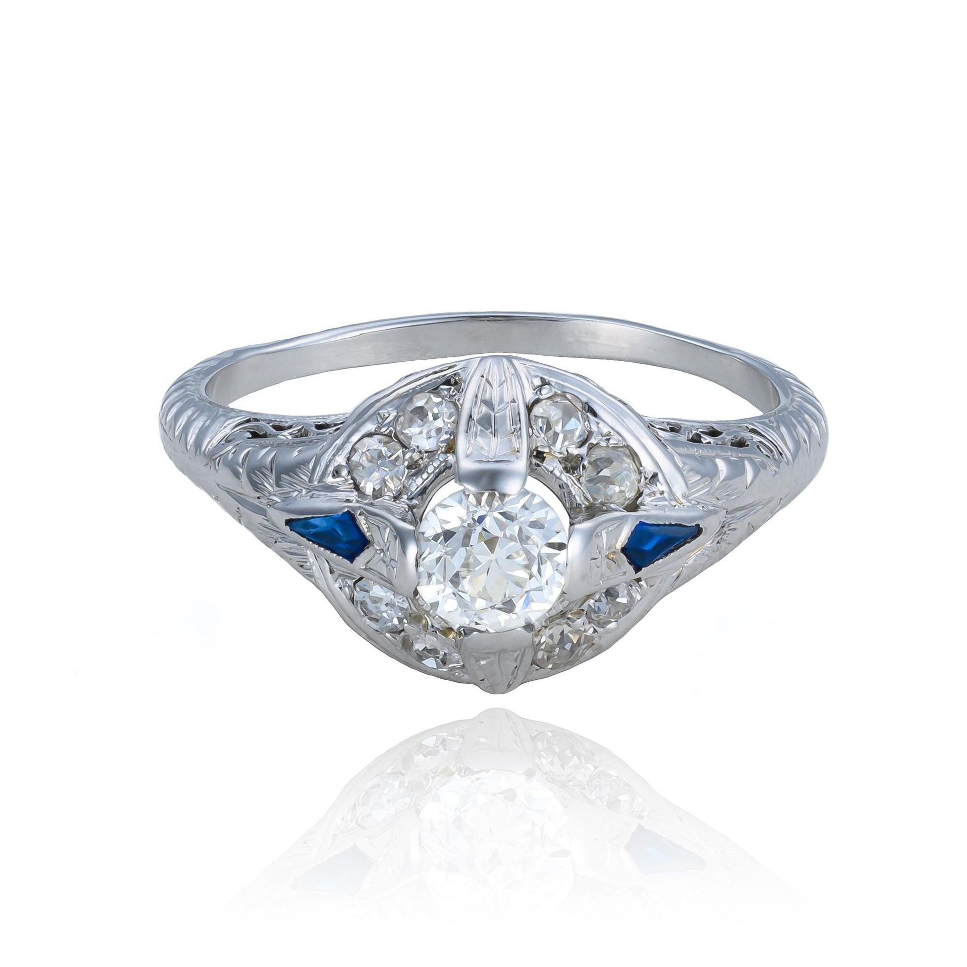 ANTIQUE Edwardian Old Mine Cut Diamond & Sapphire Filigree Ring made in 18K White Gold. This spectacular, unique piece features an Old Mine Cut Diamond set in 18K white gold, accented by kite shaped blue sapphires and additional antique diamonds. The elegant Edwardian setting features intricate etch and scroll work. The way in which the center stone is held is incredibly unique. The center diamond weighs approximately 0.5 ct.