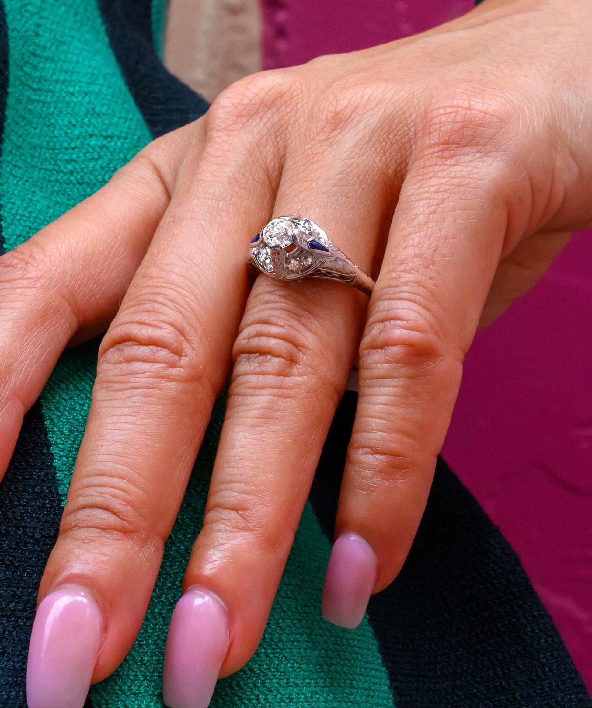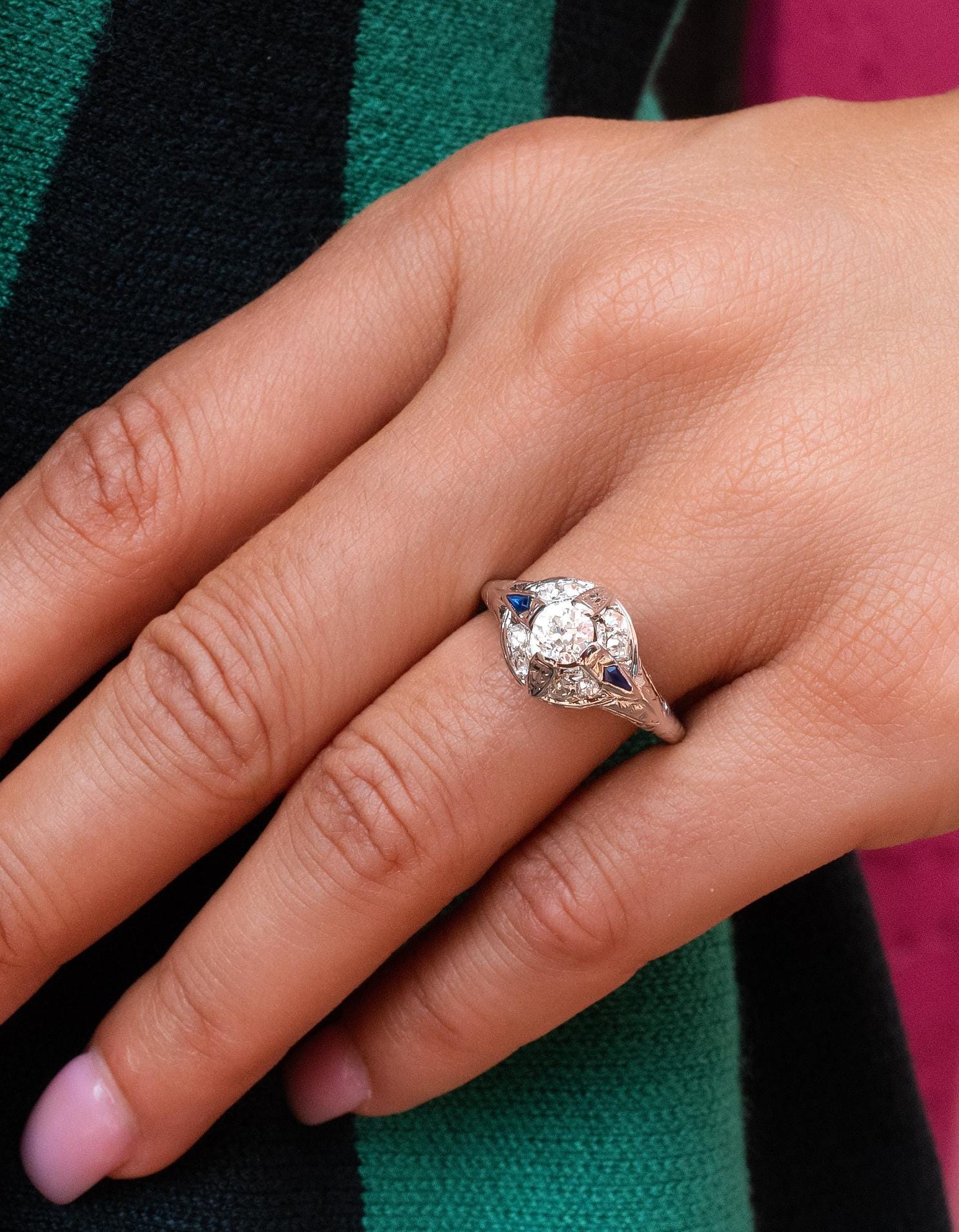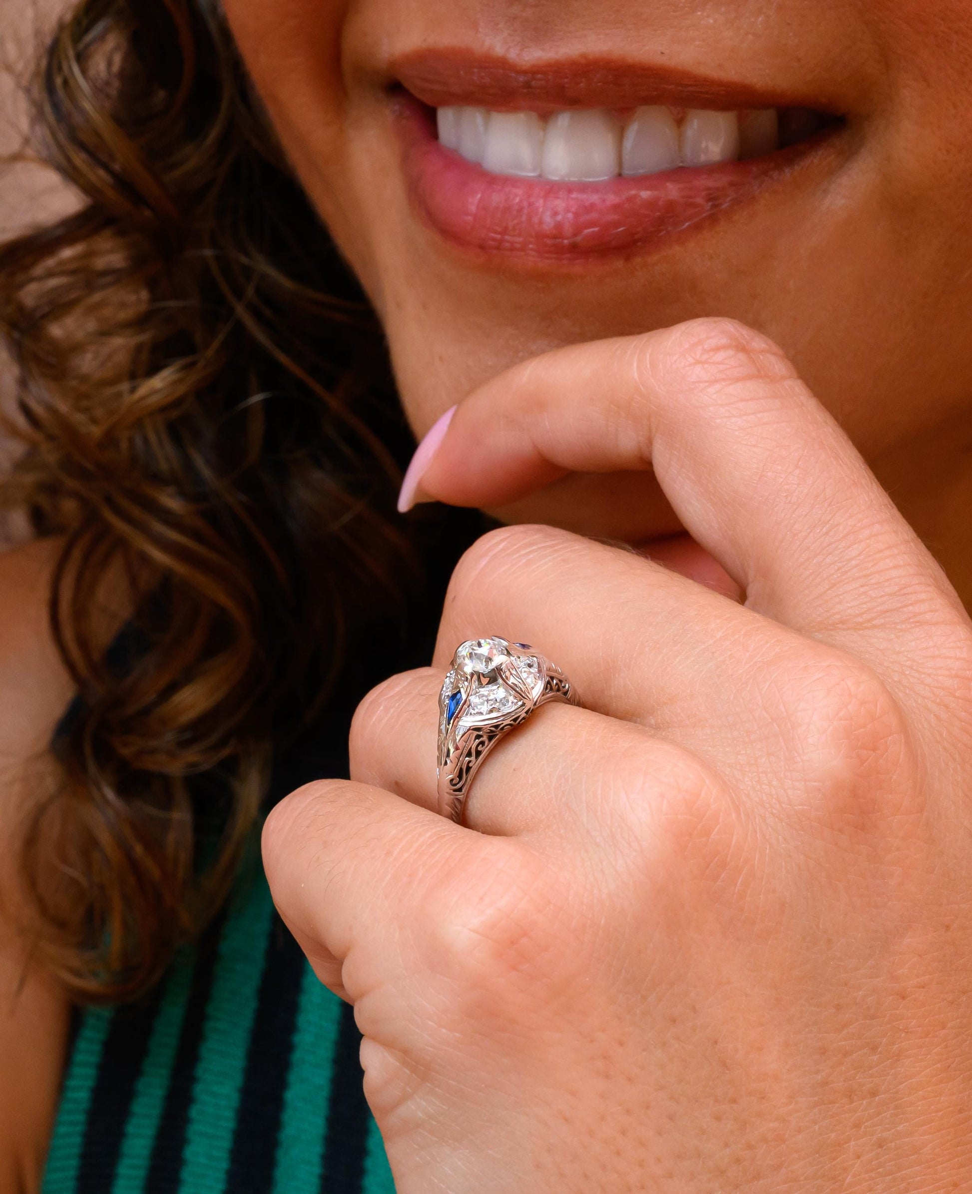 Edwardian Old Mine Cut Diamond & Sapphire Filigree Ring in 18K White Gold