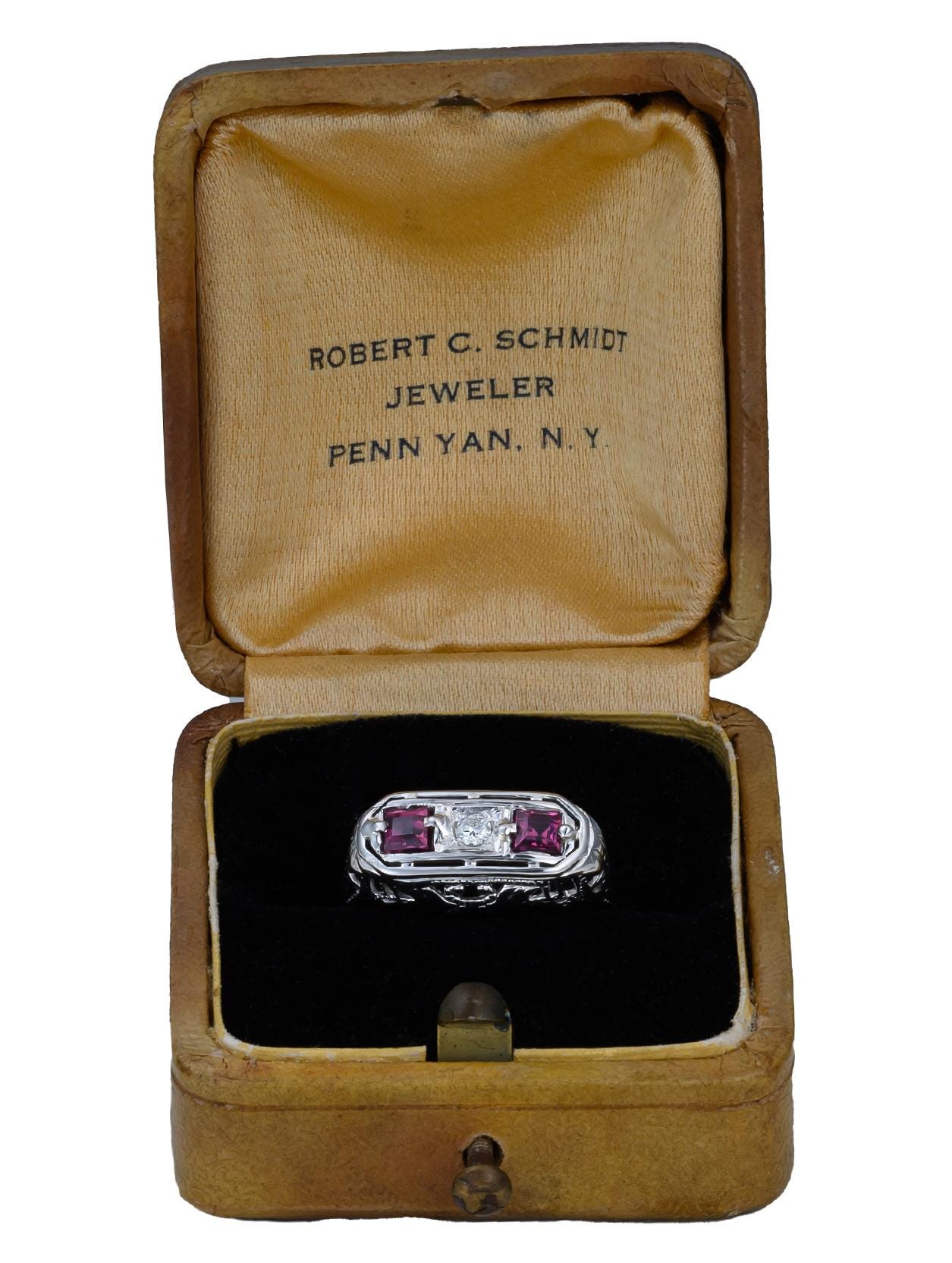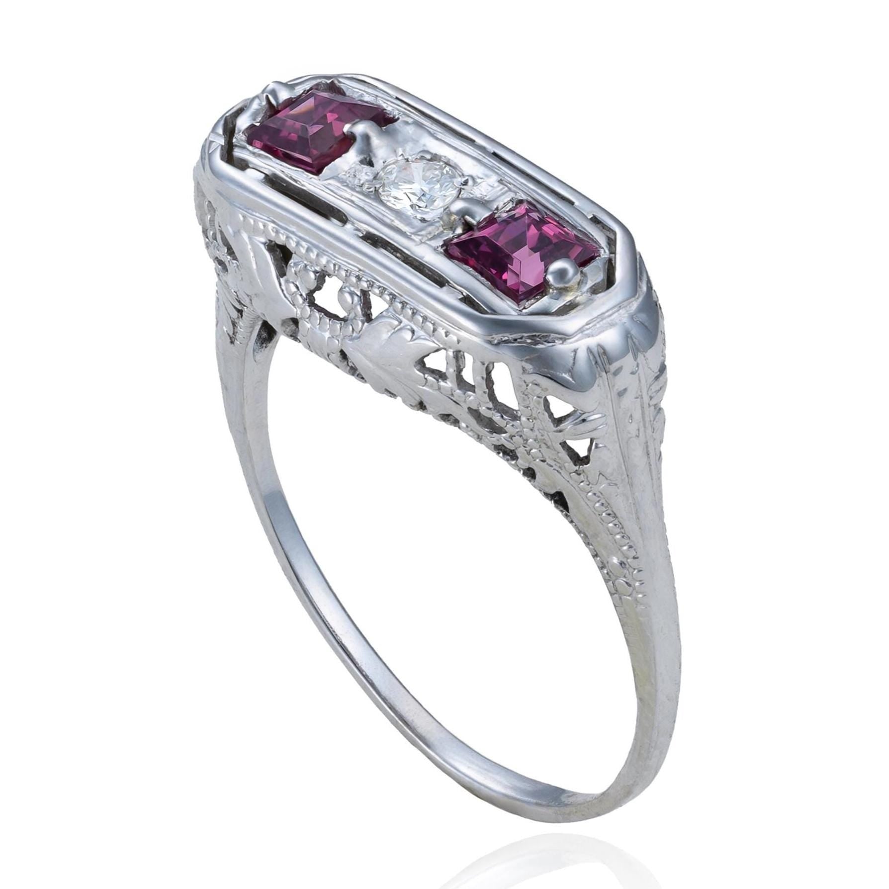 The three stone style of this Deco ring is known as a trilogy ring. Trilogy rings have three primary stones which represent the past, present and future.
