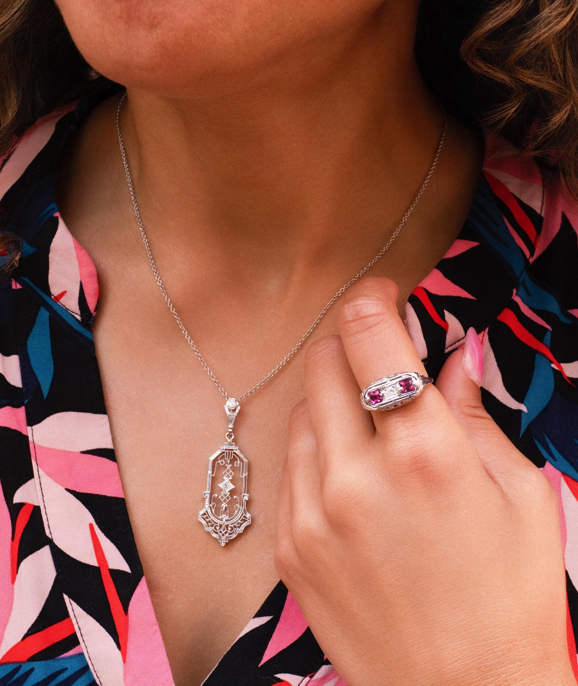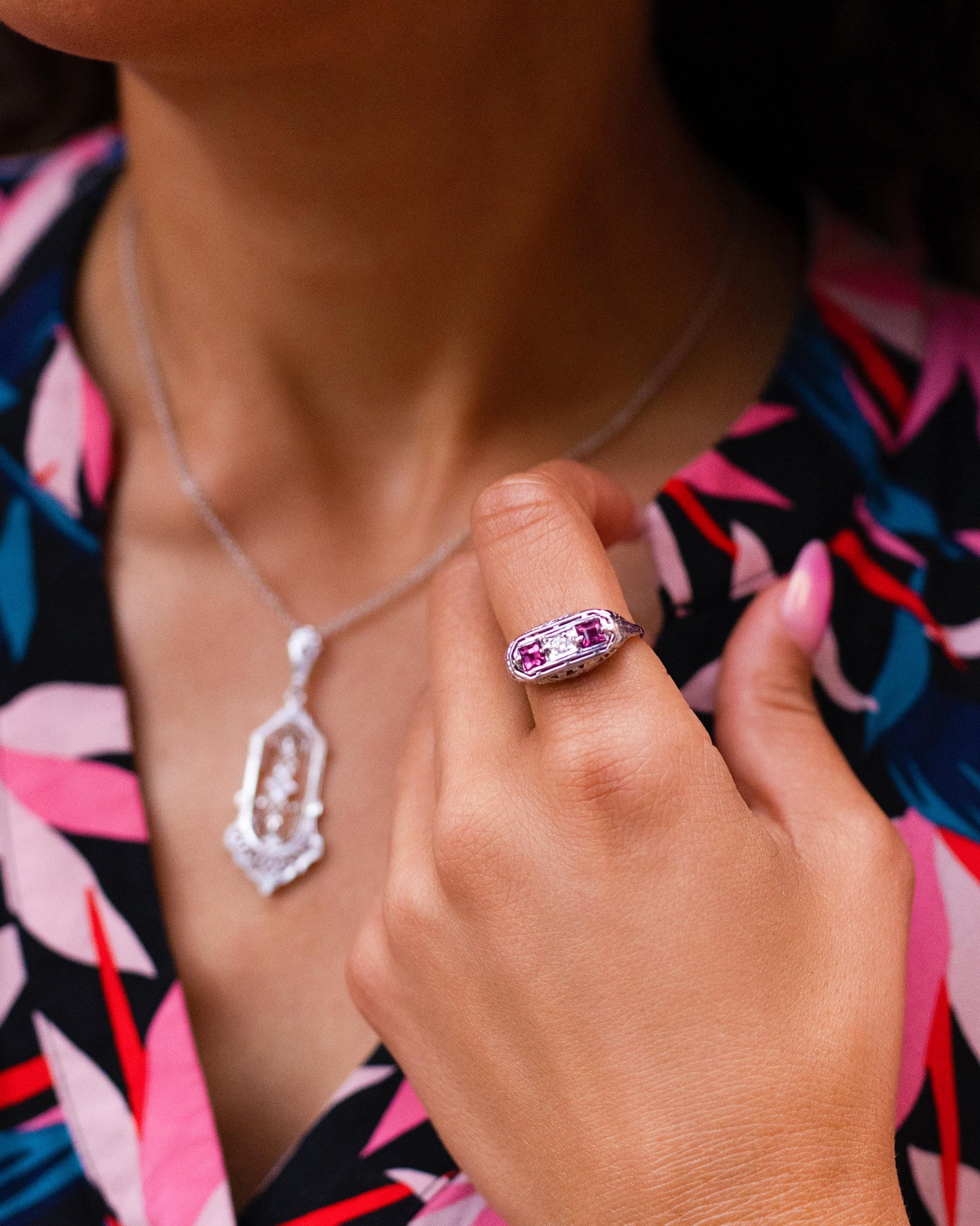 Edwardian Pink Tourmaline & Diamond Trilogy Filigree Ring in 18K White Gold