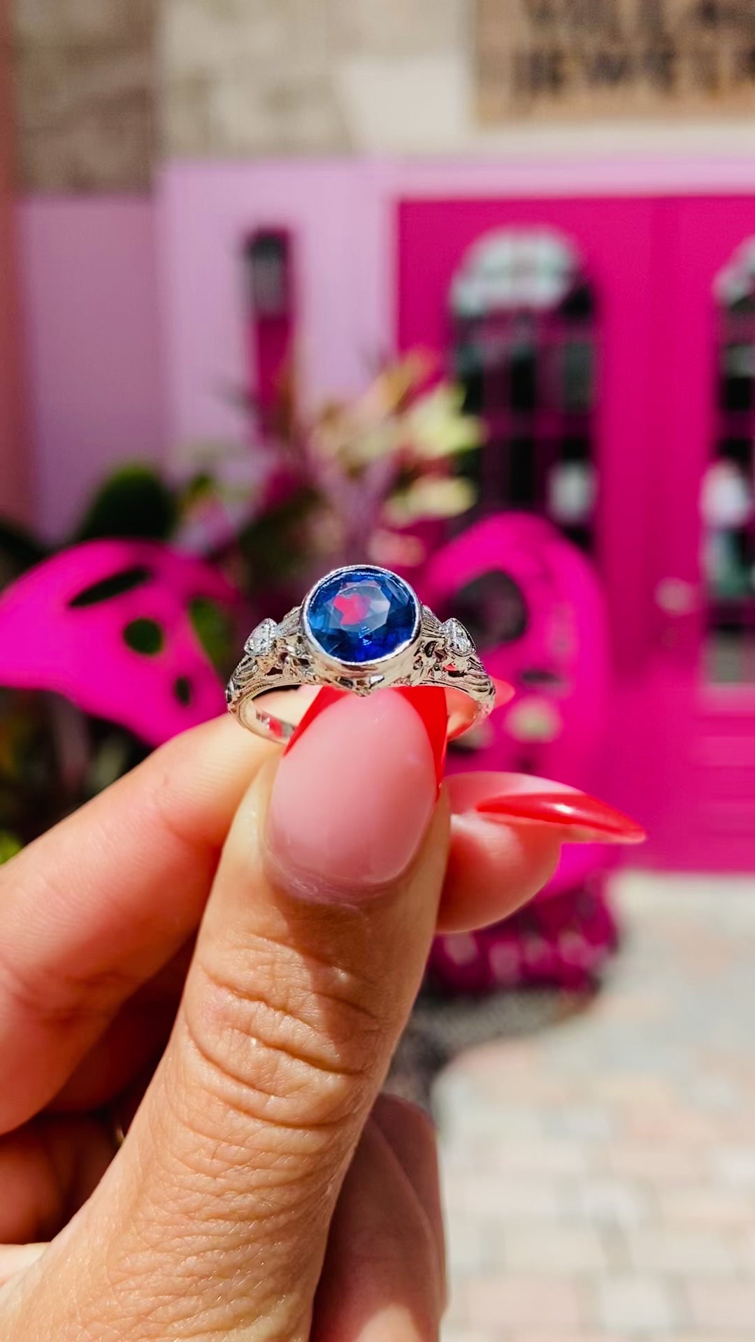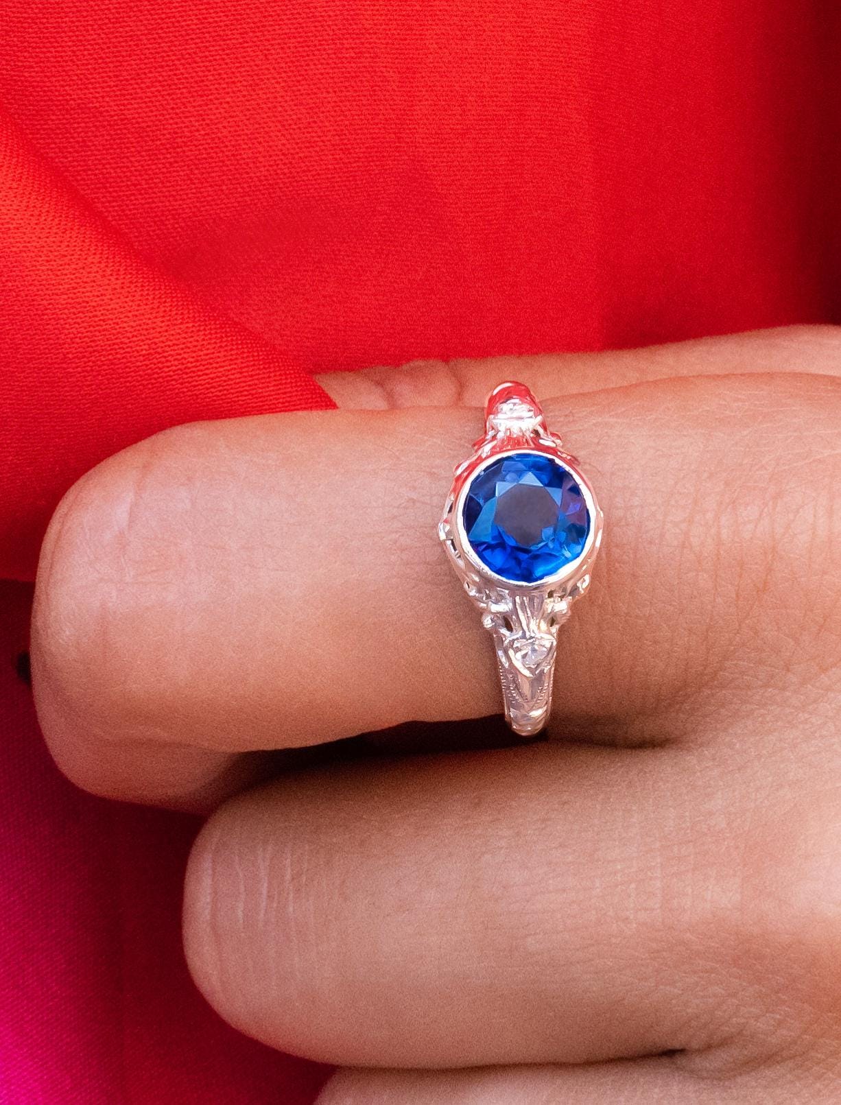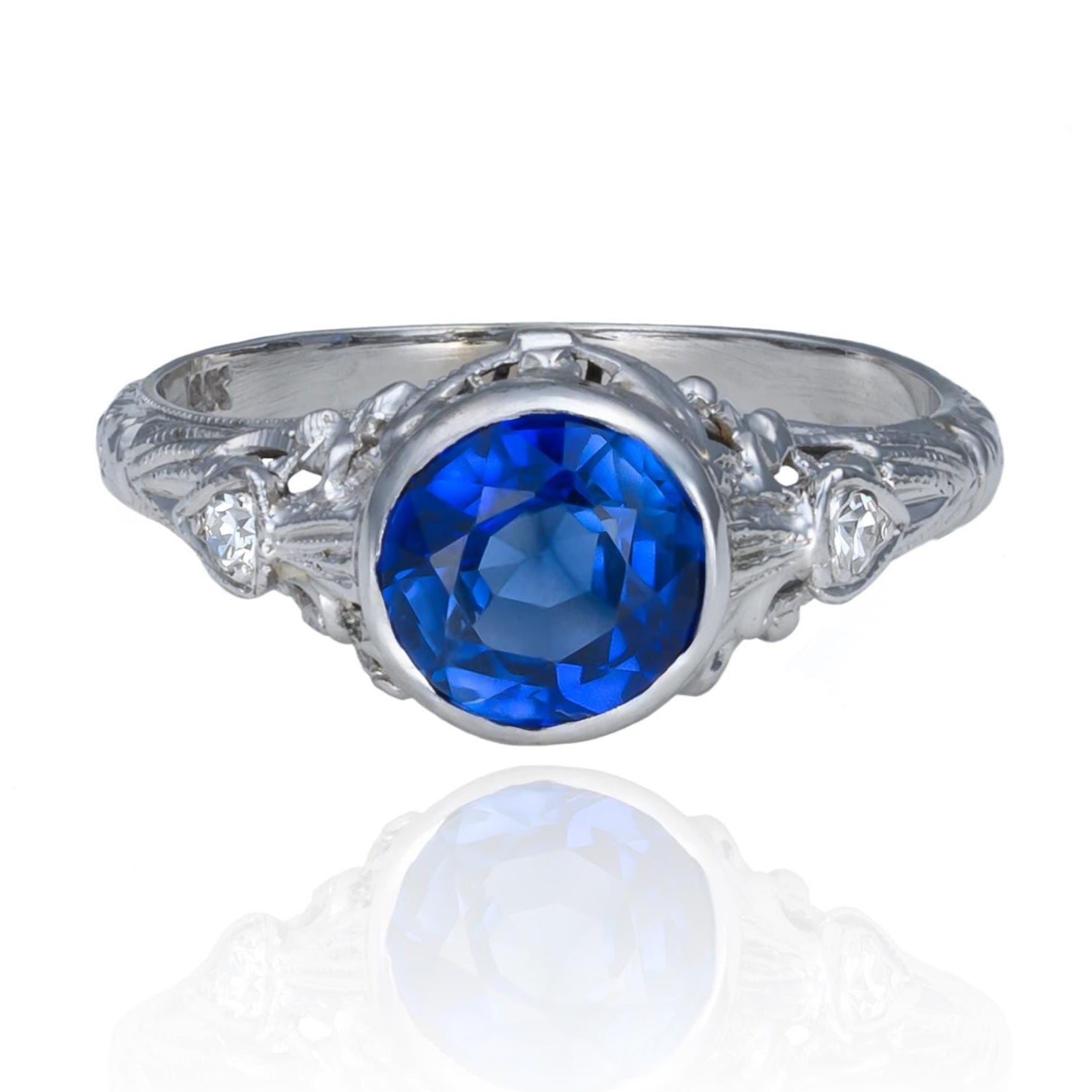 ANTIQUE Edwardian Sapphire & Diamond Ring made in 18K White Gold. This breathtaking antique features a vivid, bezel-set blue sapphire weighing approximately 1.85 ct. accented by two single cut diamonds. This ring is solid, very well made, and has a nice weight to it.