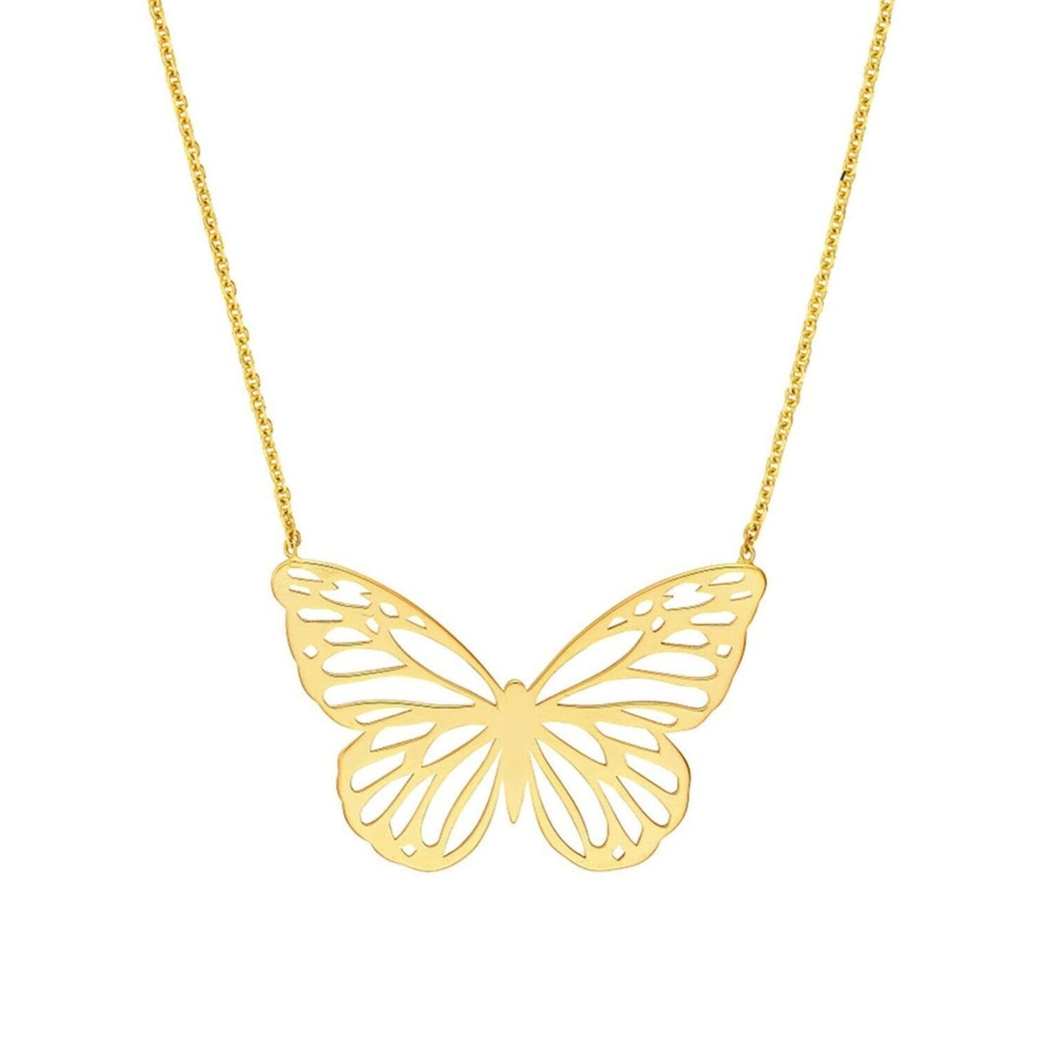 Butterfly cut-out necklace in 14K Yellow Gold. This beautiful necklace is solid and will make a statement. Adjustable cable chain length from 16"-18". The pendant measures approximately 32 x 21 mm. Video coming soon!