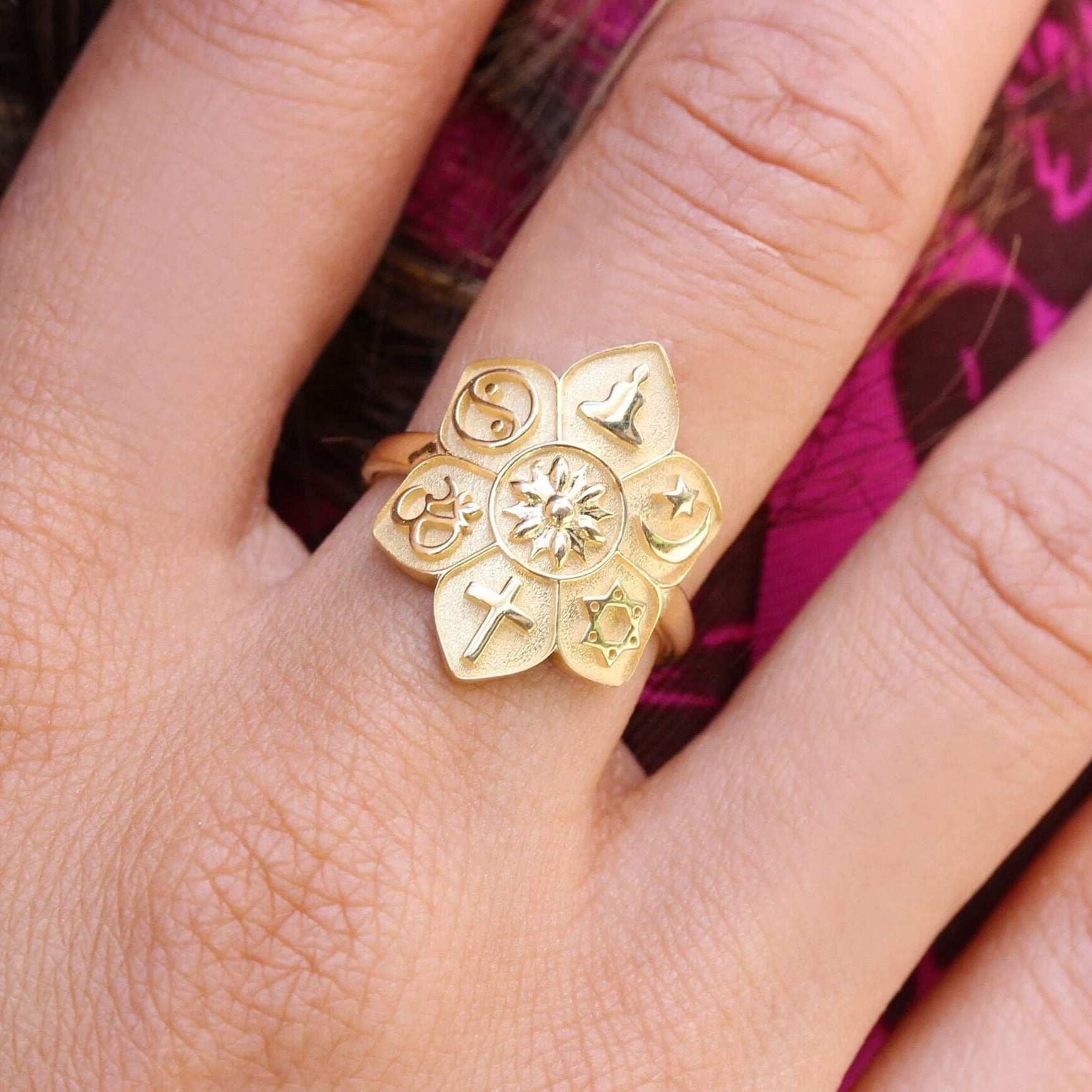The solid 14k yellow gold ring, shaped like a beautiful lotus flower includes a Christian cross, an Islamic crescent moon and star, a Jewish star of David, a Buddhist Buddha, a Hindu Om, and a Taoist yin yang. The face of the ring is matte finished, and the symbols are shiny, making them really pop! In the very center, is another lotus flower.