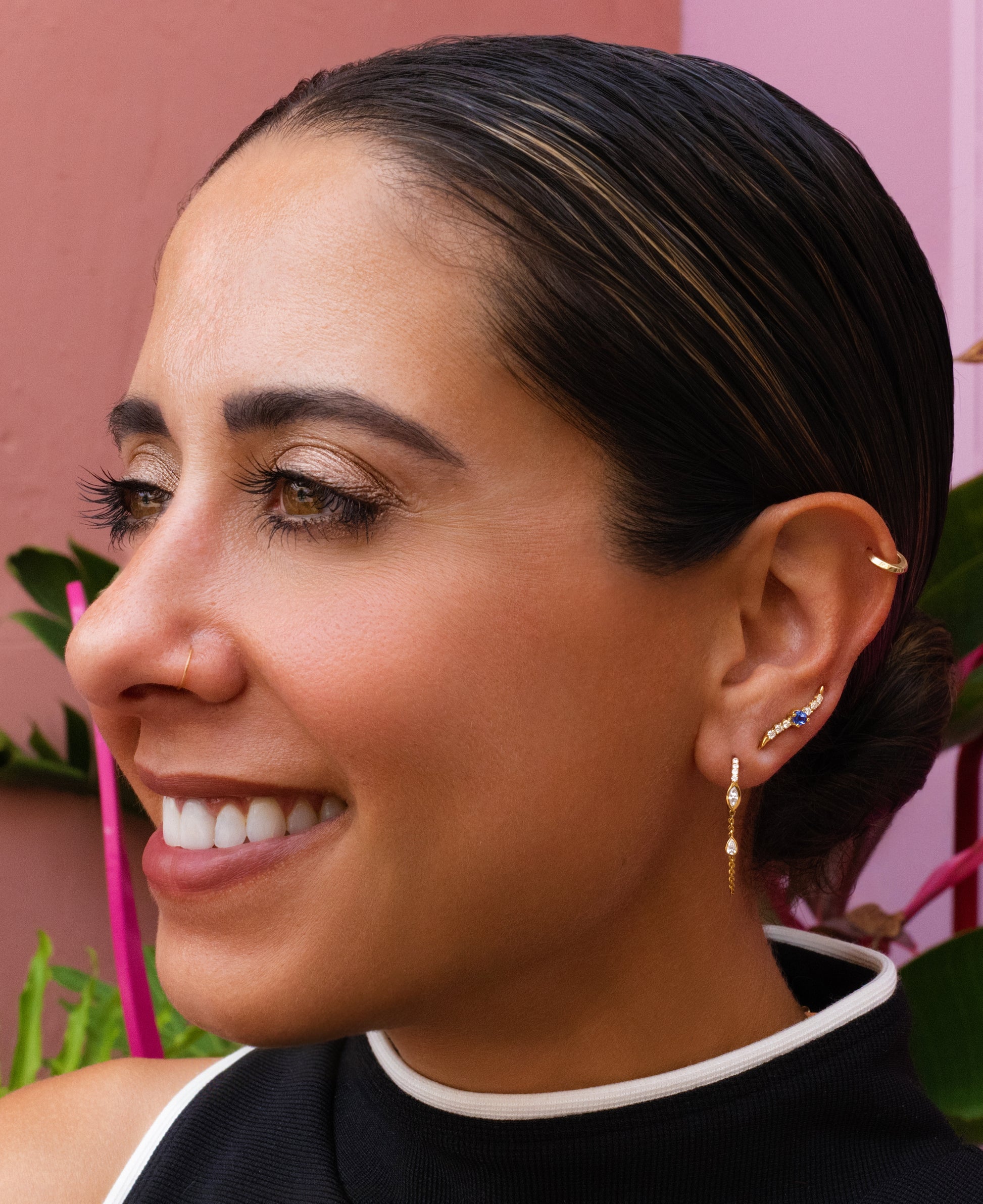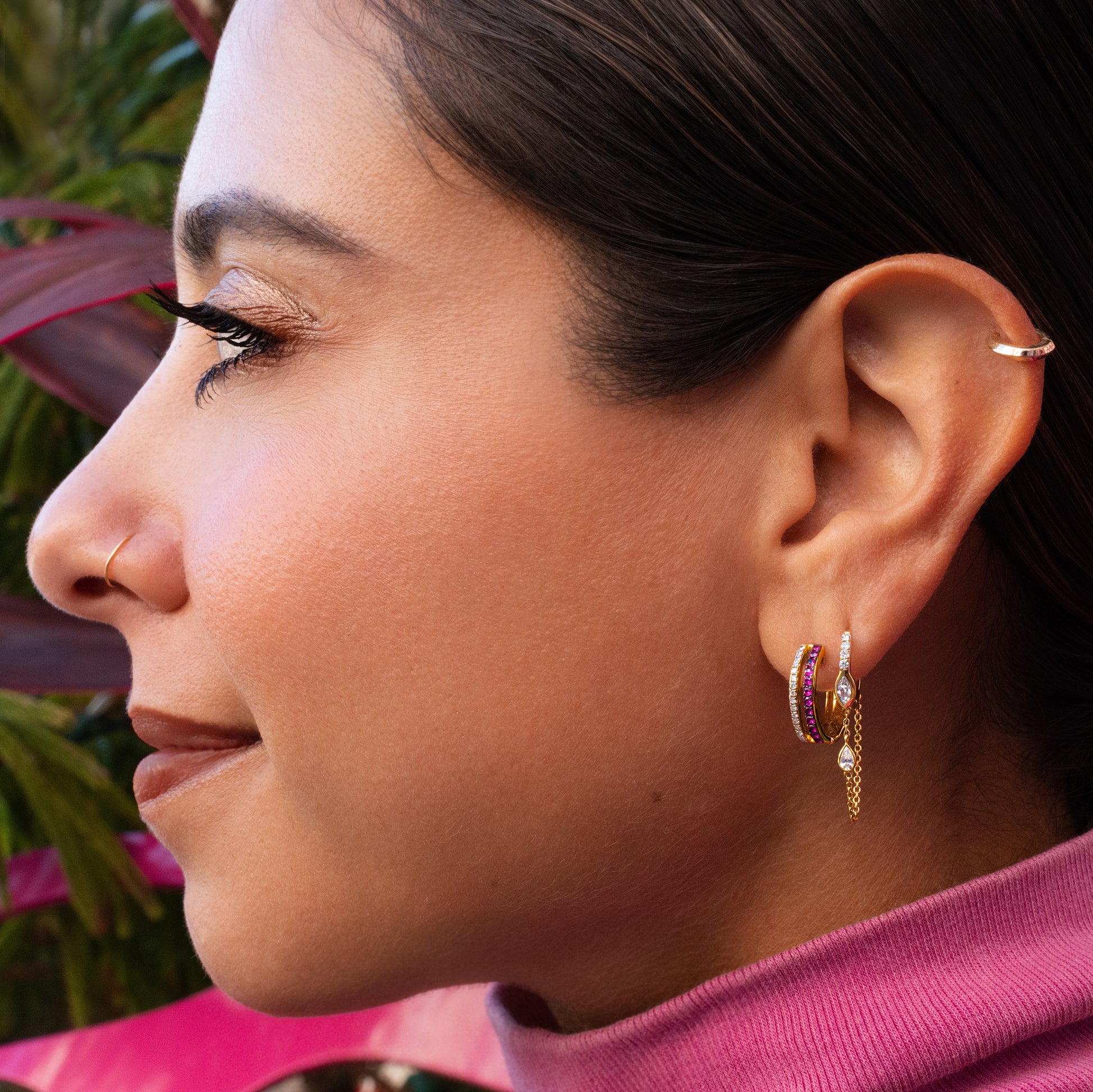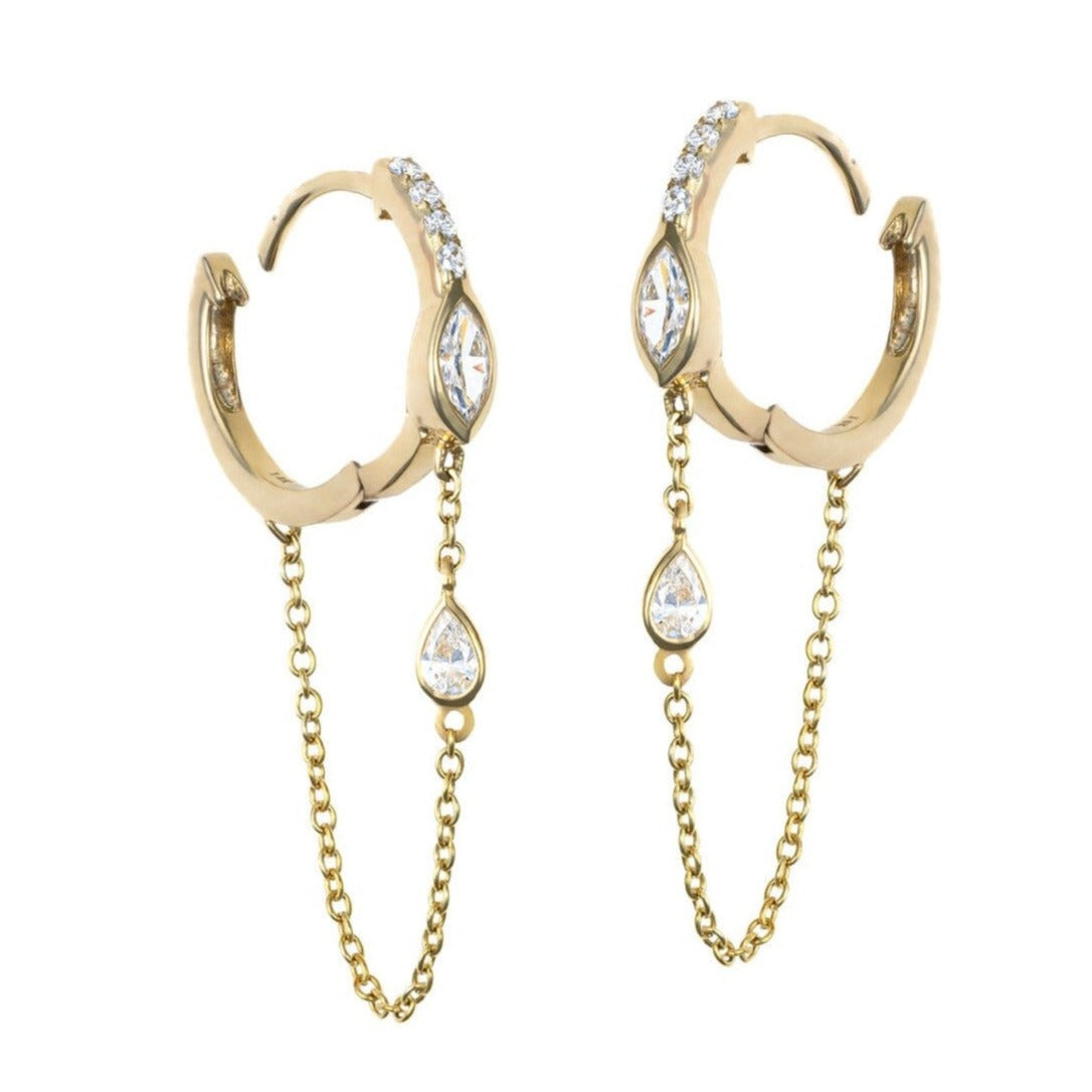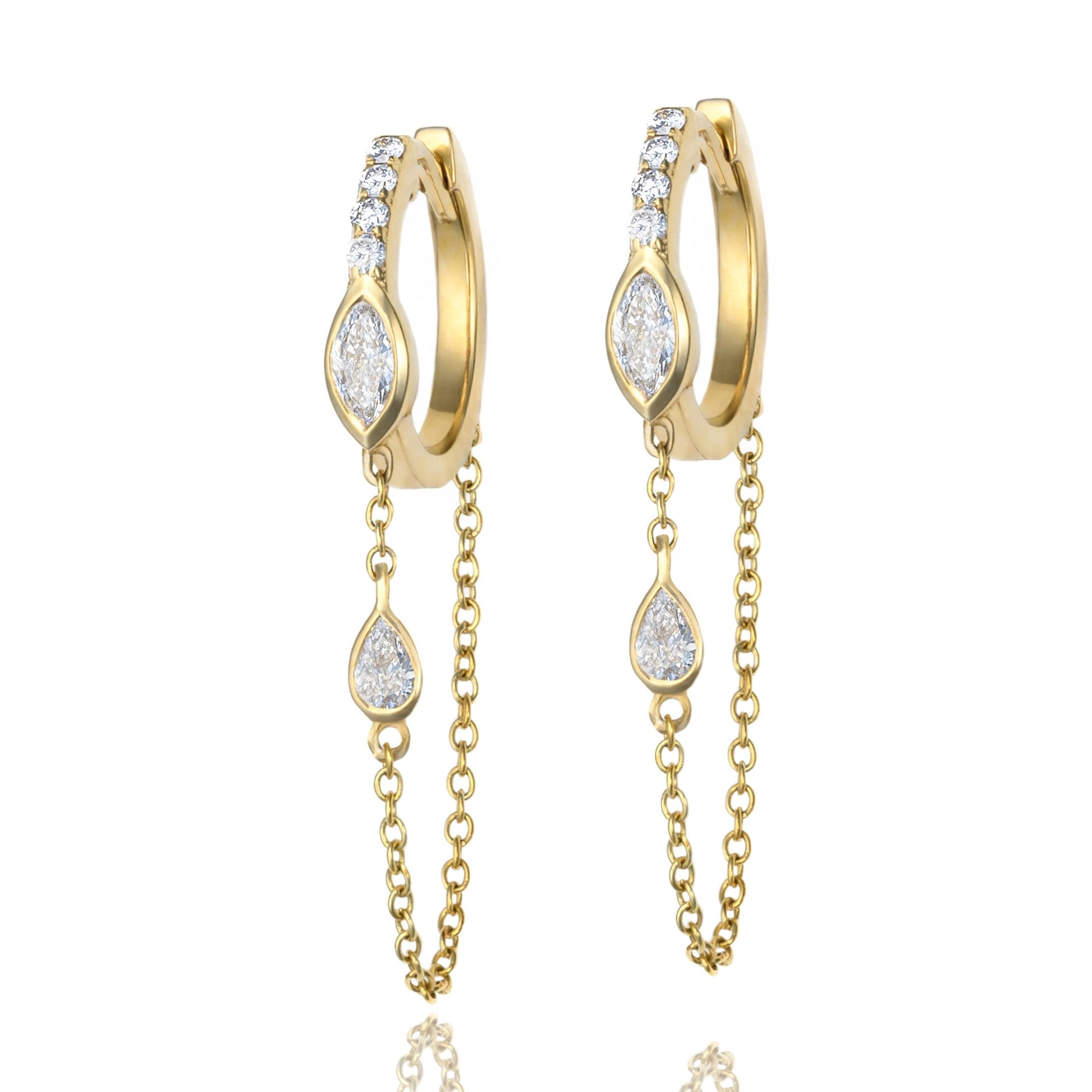 Meet your new favorite pair of earrings. These Diamond Chain Huggie Hoop Earrings in 14K Yellow Gold are comfortable, versatile, stylish and modern with the perfect amount of sparkle. They feature bezel set, natural marquise and pear-shaped diamonds with round brilliant accents.