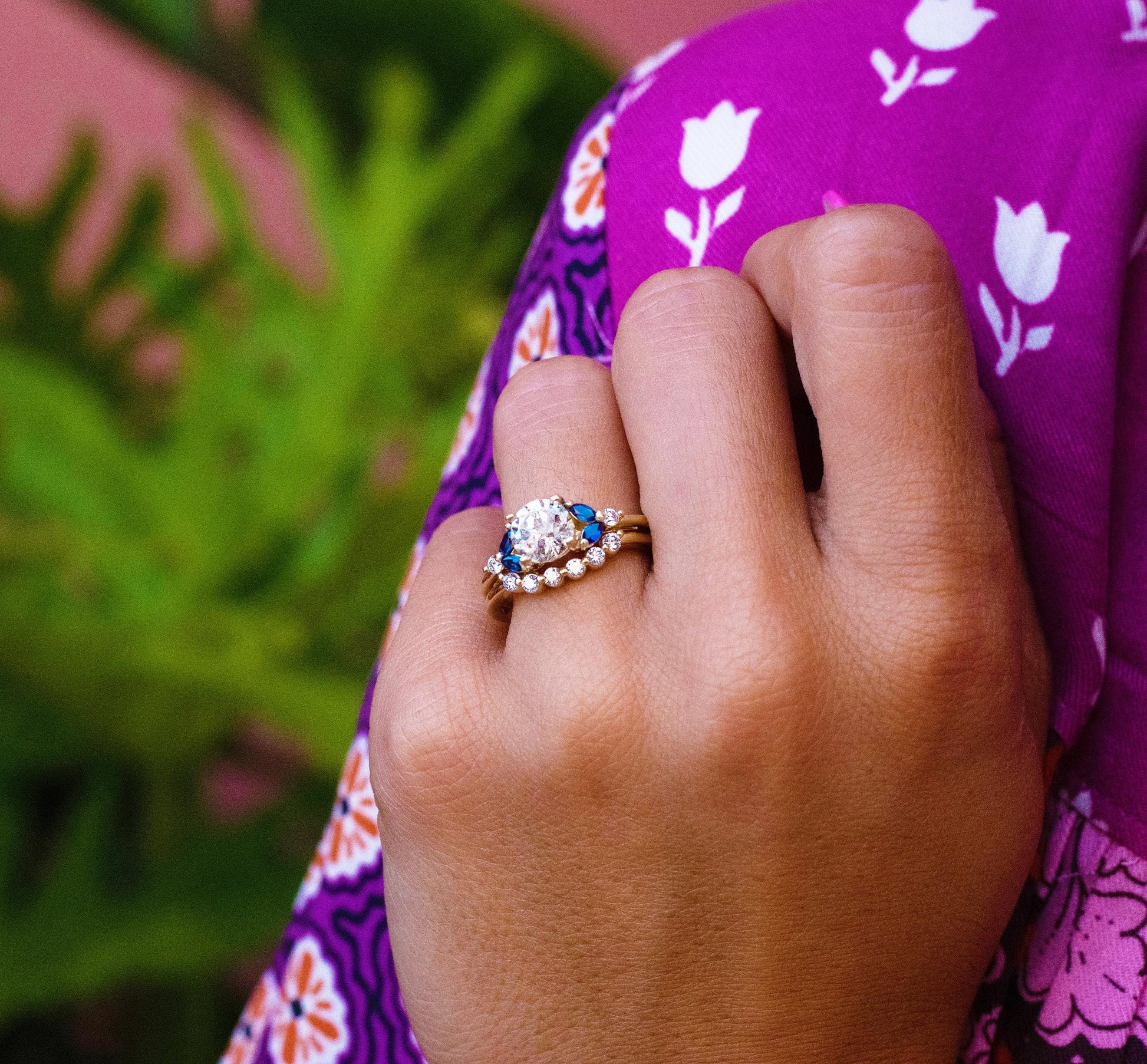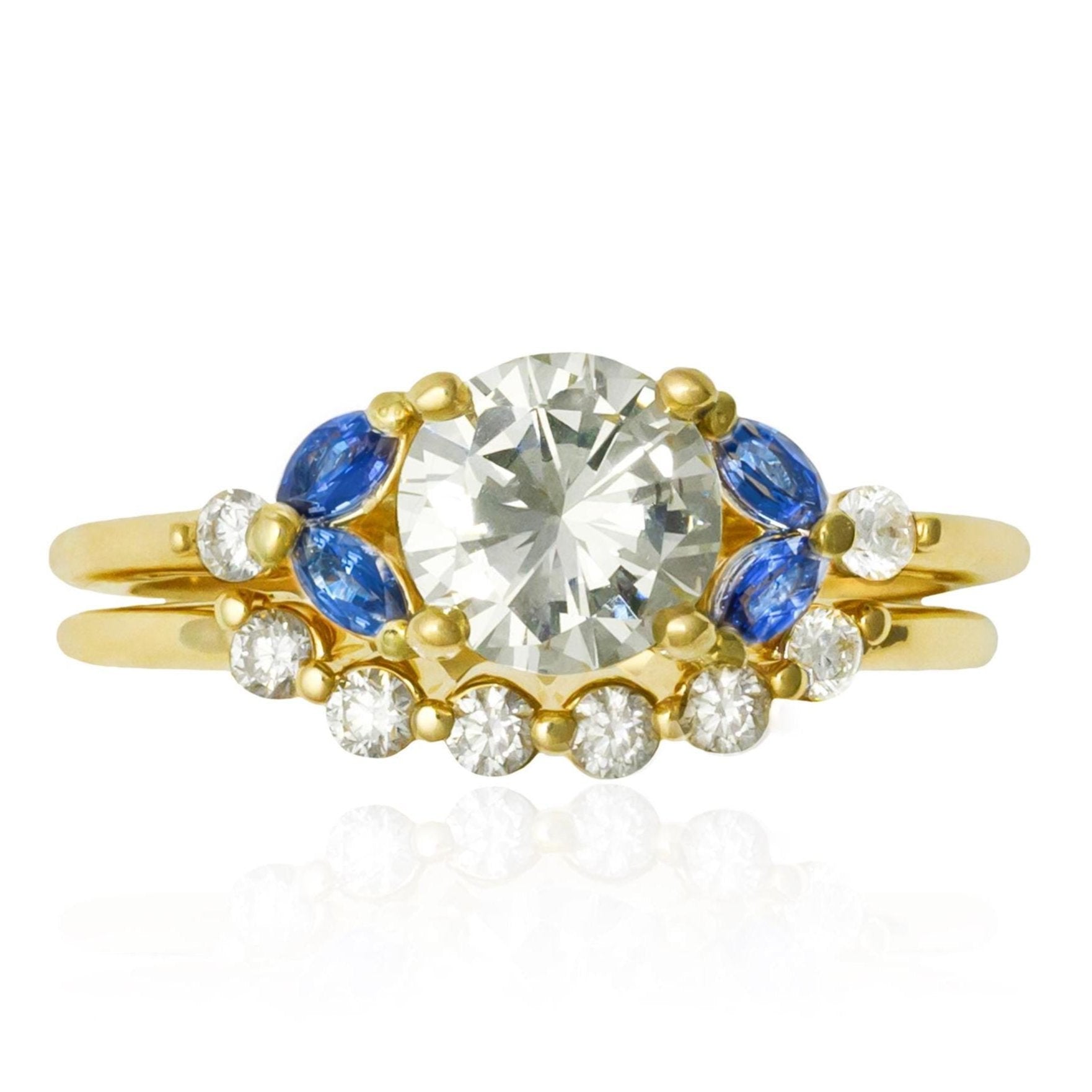 Diamond & Sapphire Floral Inspired Bridal Set crafted in 14K Yellow Gold. This stunning set features natural diamonds and sapphires. The contour band ensures a seamless fit.