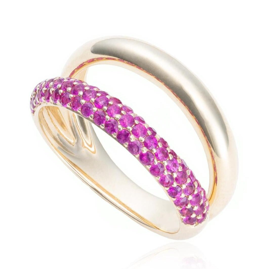 Double Band Pavé Ruby Ring crafted in 14K Yellow Gold. This gorgeous, modern design features .90 ct. of natural pavé set rubies.