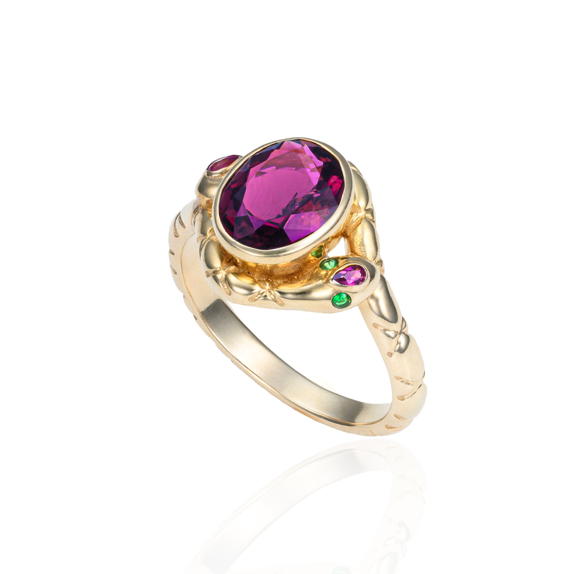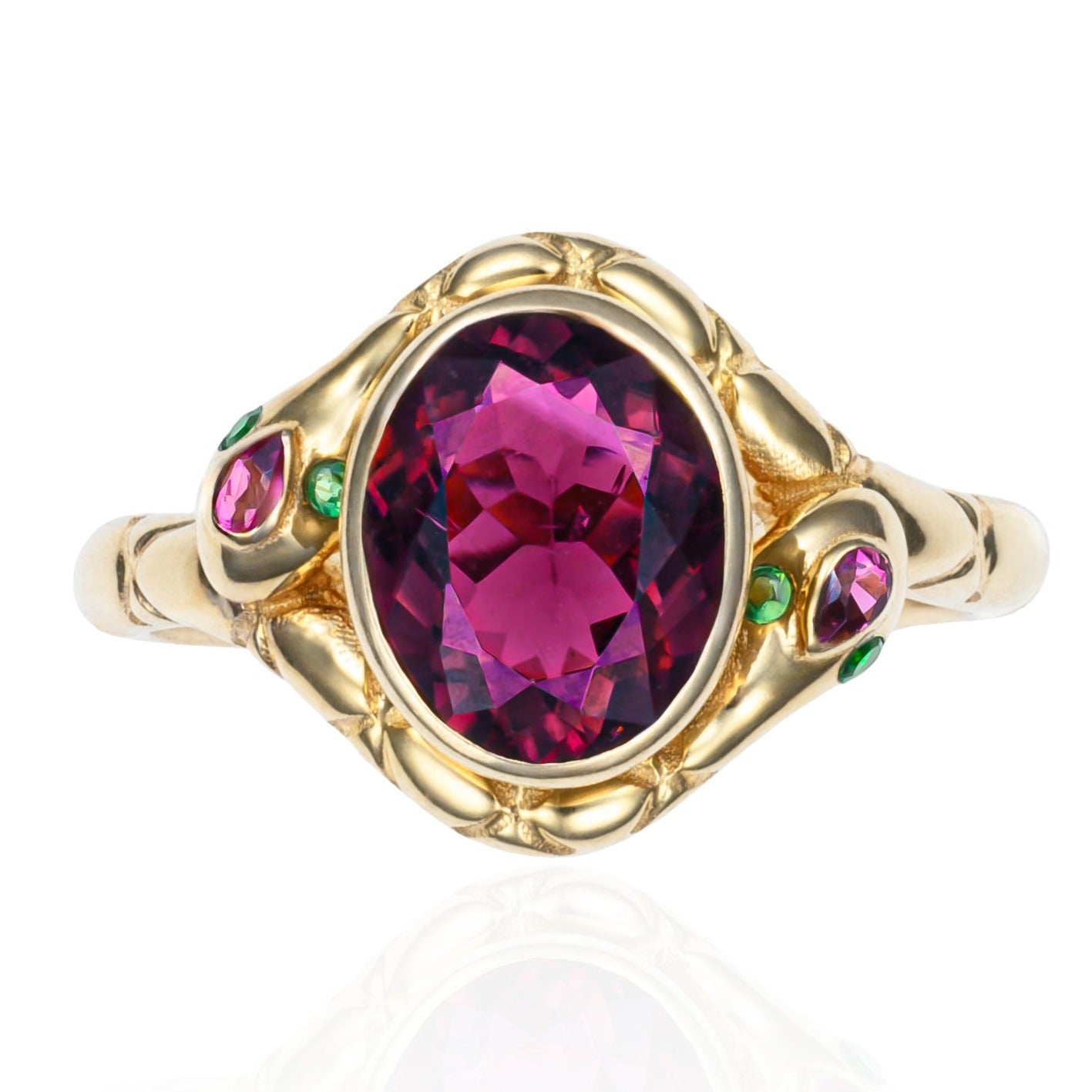 A village jewelry original. Double Ouroboros Pink Tourmaline & Tsavorite Garnet Serpent Ring crafted in 14K Yellow Gold. This unique, mystical statement piece features an oval 8 x 10mm pink tourmaline center stone, two 2.5 x 1.5mm pear shaped pink tourmalines adorning the snakes heads and four 1.5mm tsavorite garnets in the eyes.