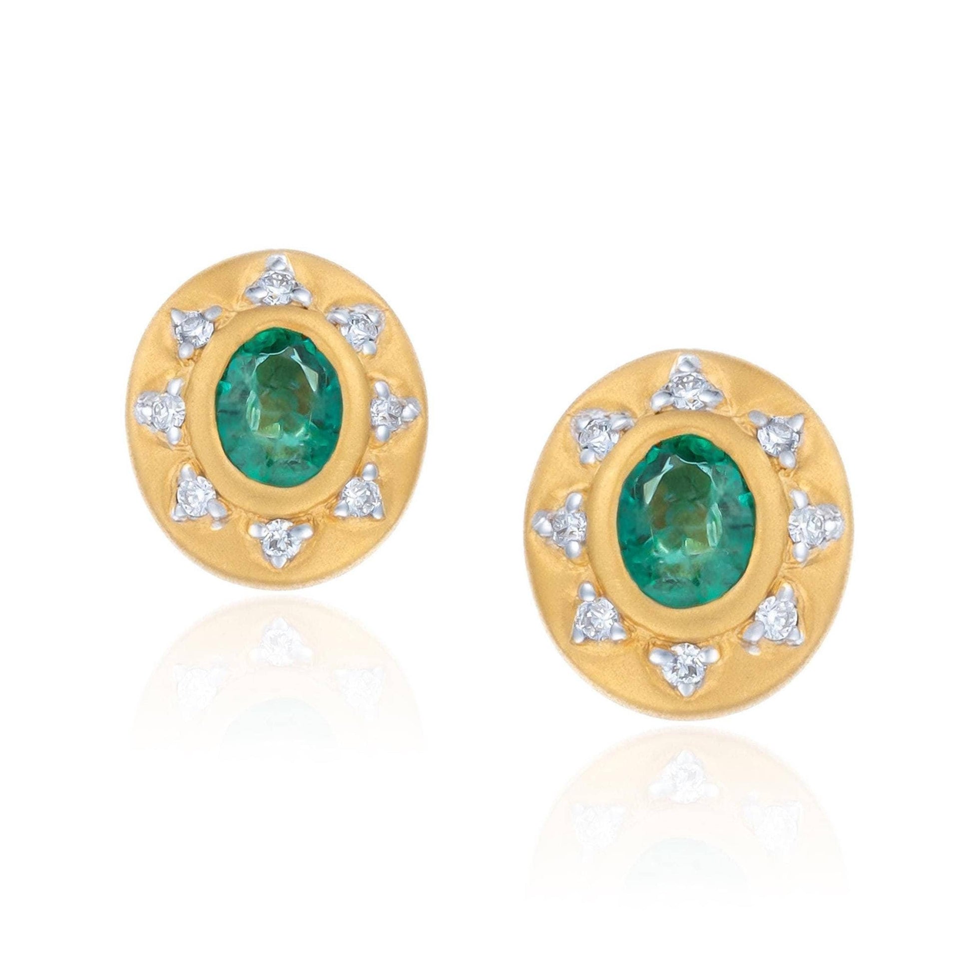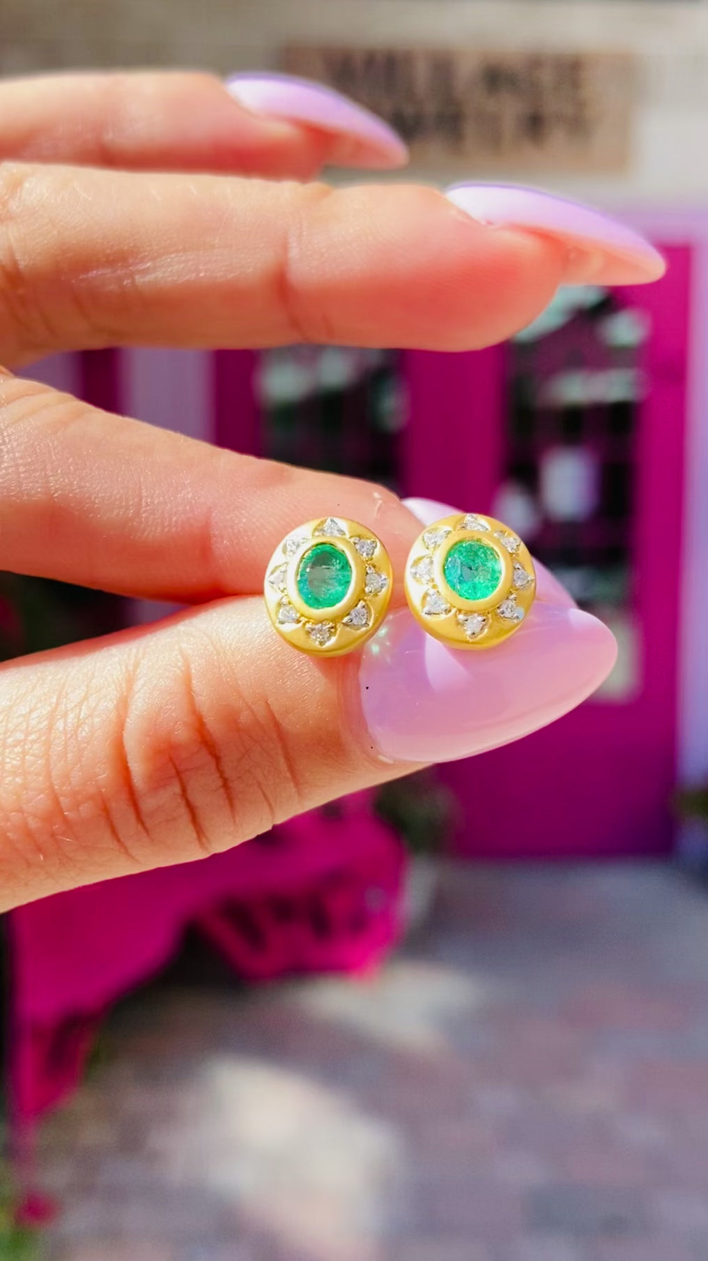 Emerald Diamond Halo Stud Earrings made in 18K Yellow Gold. These one-of-a-kind, artisan made studs feature .6 ctw. of natural, oval Emeralds accented by brilliant diamond halos weighing .11 ctw. The earrings measures approximately 10 x 8.9mm and the 18K gold has a beautiful brushed finish. Push back closures.