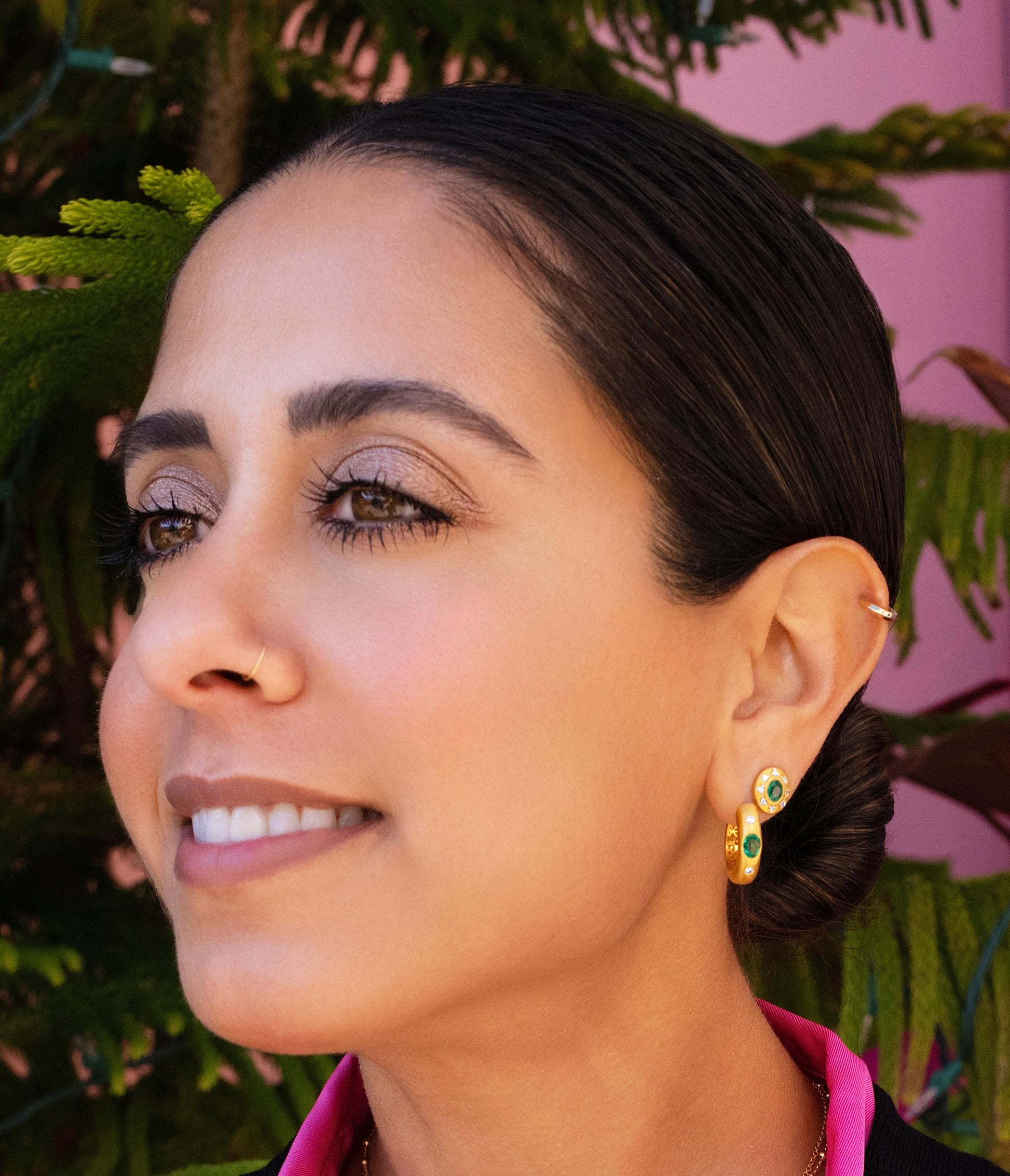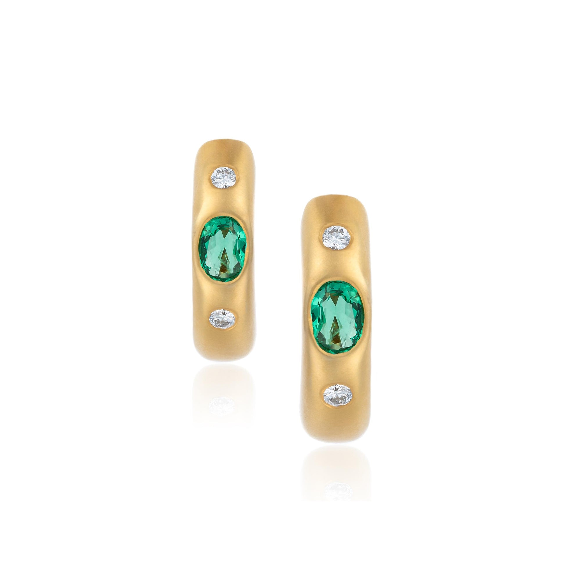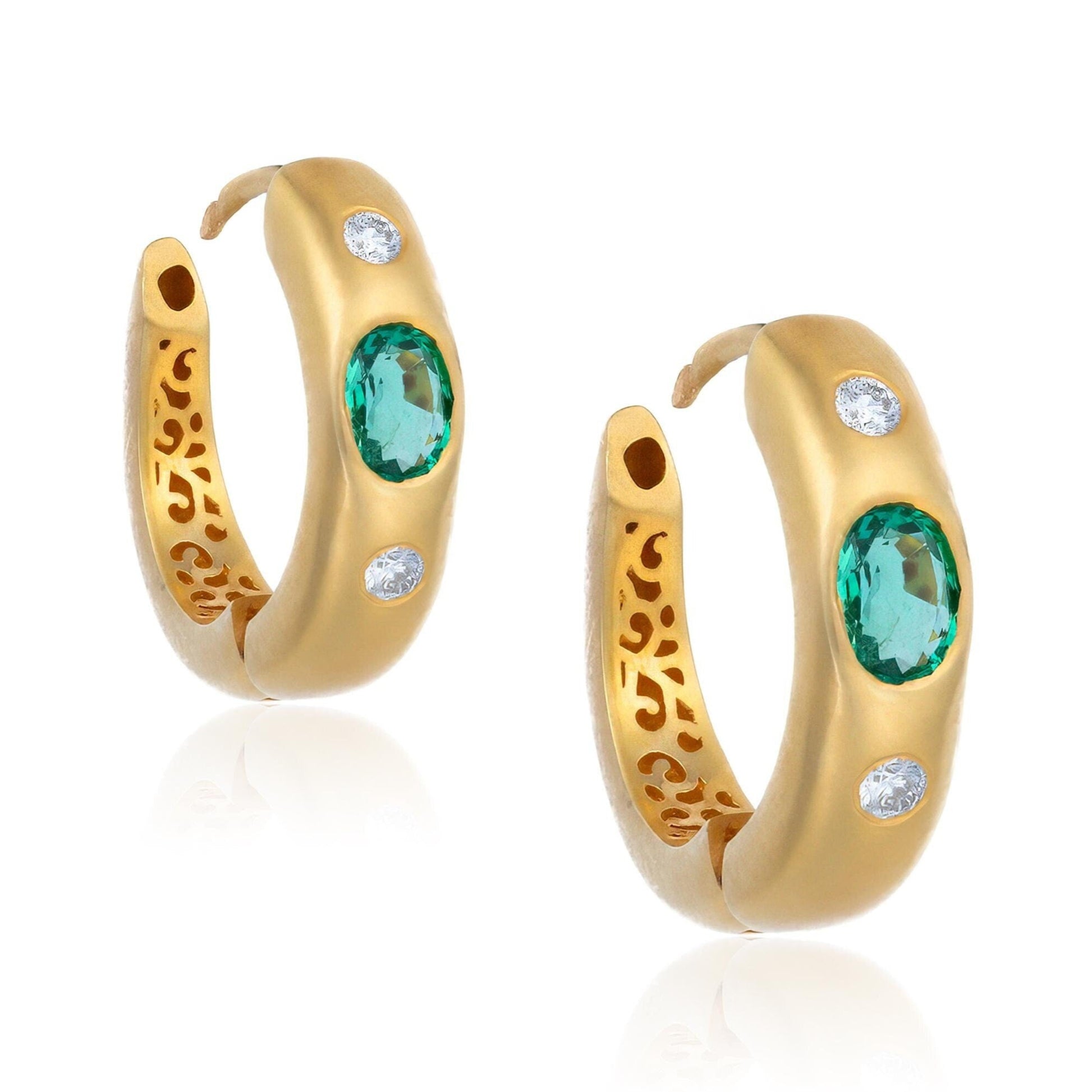 Emerald & Diamond Huggie Hoops in 18K Yellow Gold