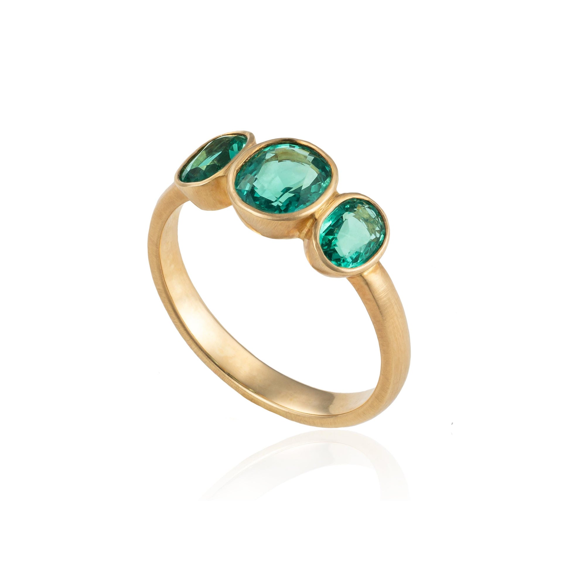 Emerald Triple Bezel Ring made in 18K Yellow Gold. This gorgeous, artisan crafted, one of a kind Emerald ring features 1.41 of natural, free-form, excellent quality Emerald. This ring was made especially for these special gems, since they are non-calibrated. The 18K gold has a gorgeous brushed finish and the band is solid. The bezel settings help protect the Emeralds.