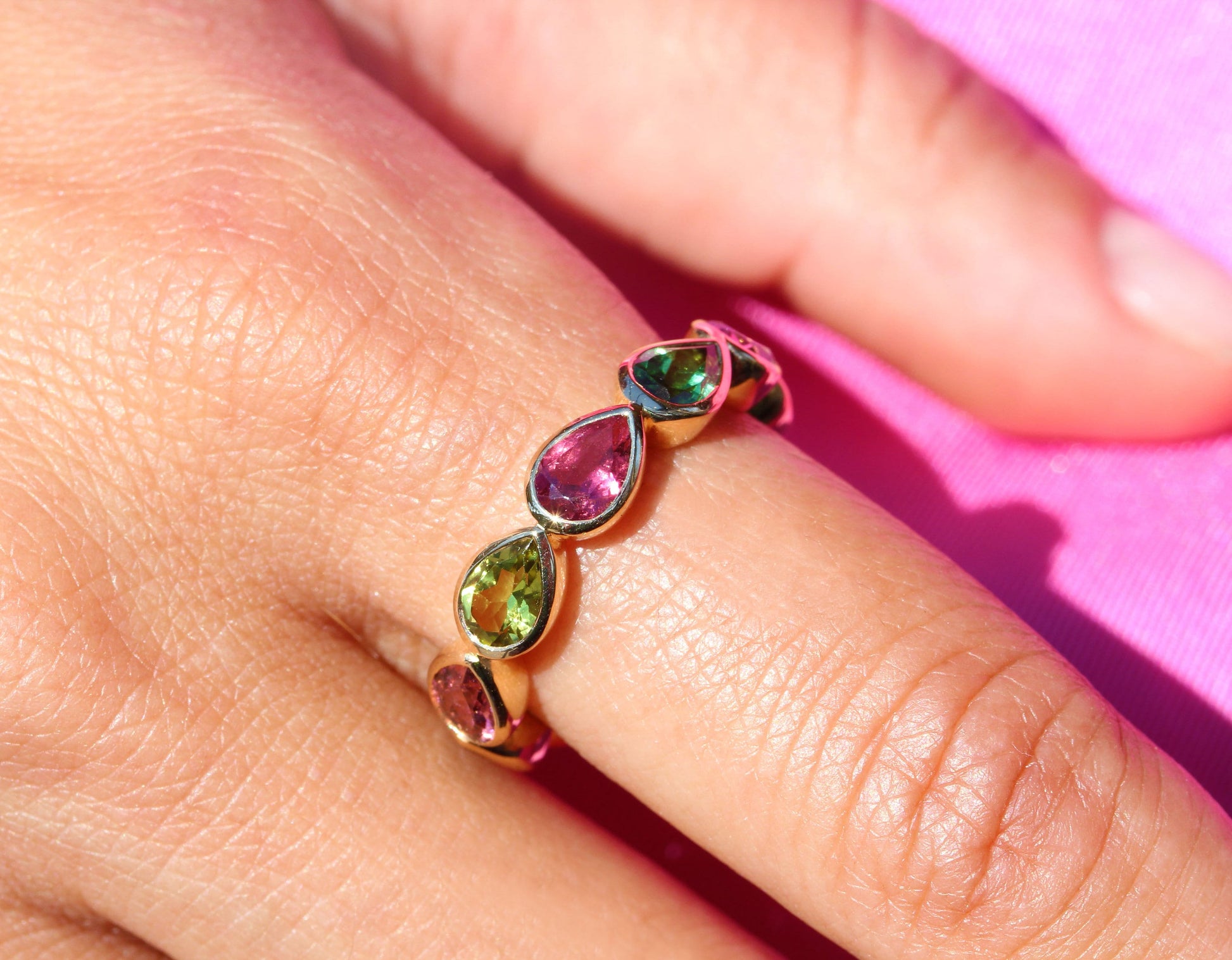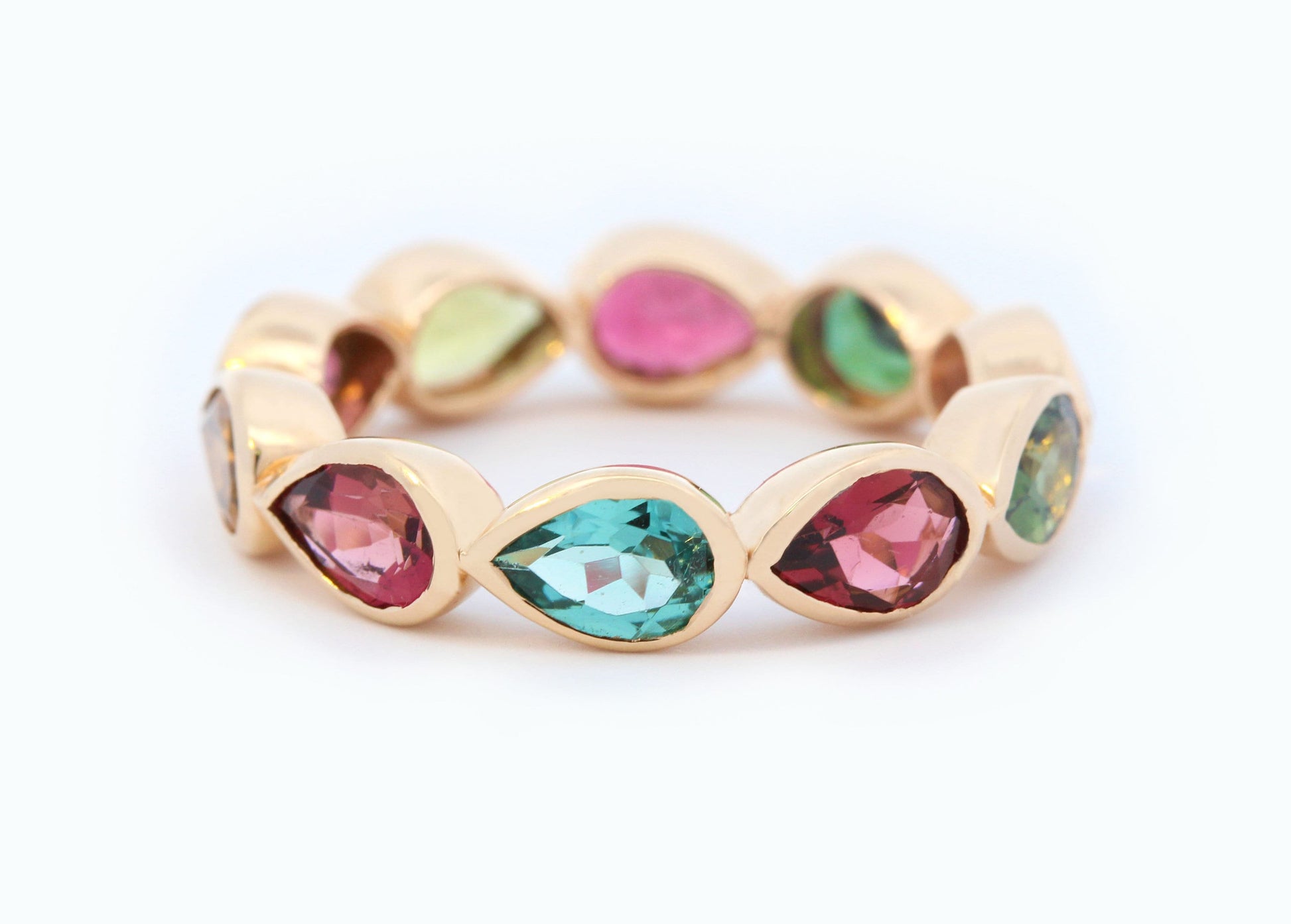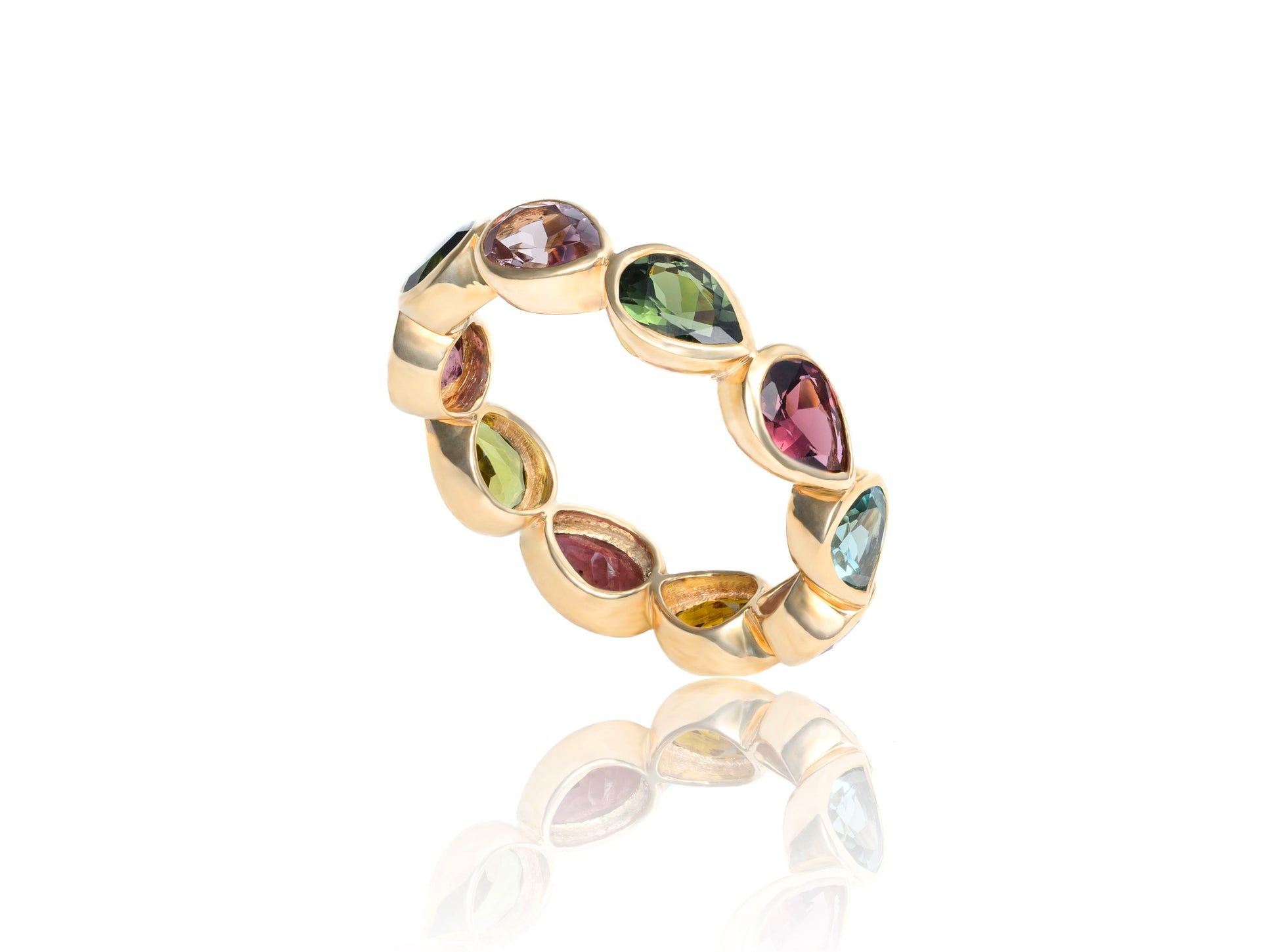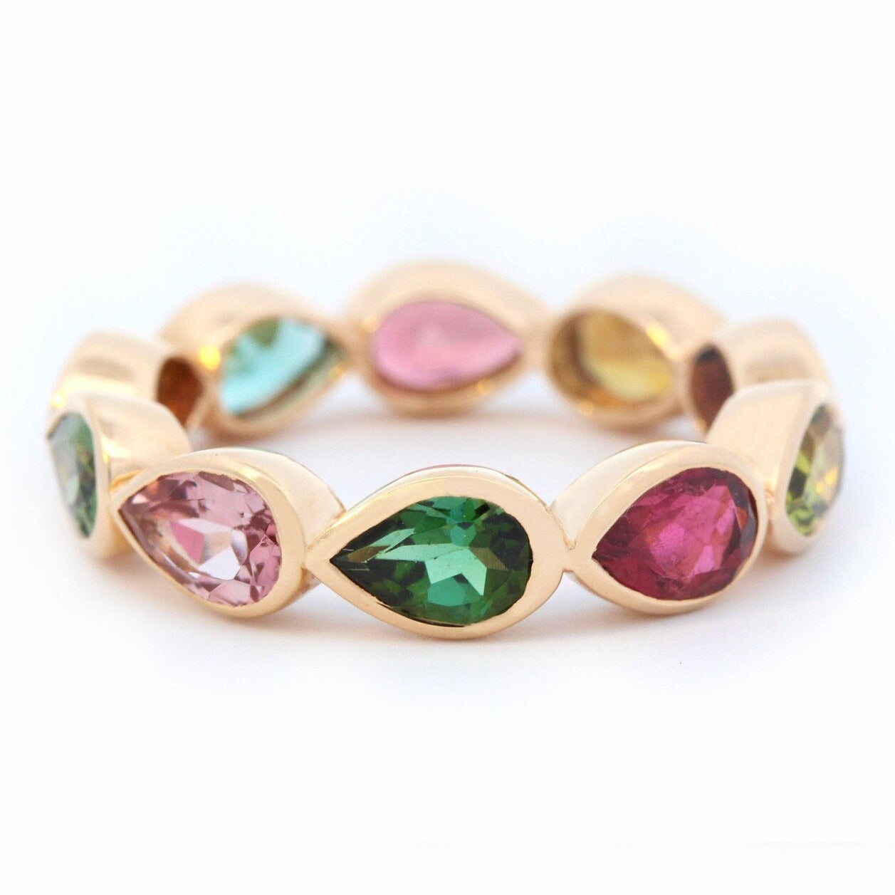 Where jaw dropping beauty meets ultimate comfort! You'll never want to take off this solid 18K yellow gold, bezel set, pear shaped, multi color, natural tourmaline ring eternity band. A stunning ring for your everyday!