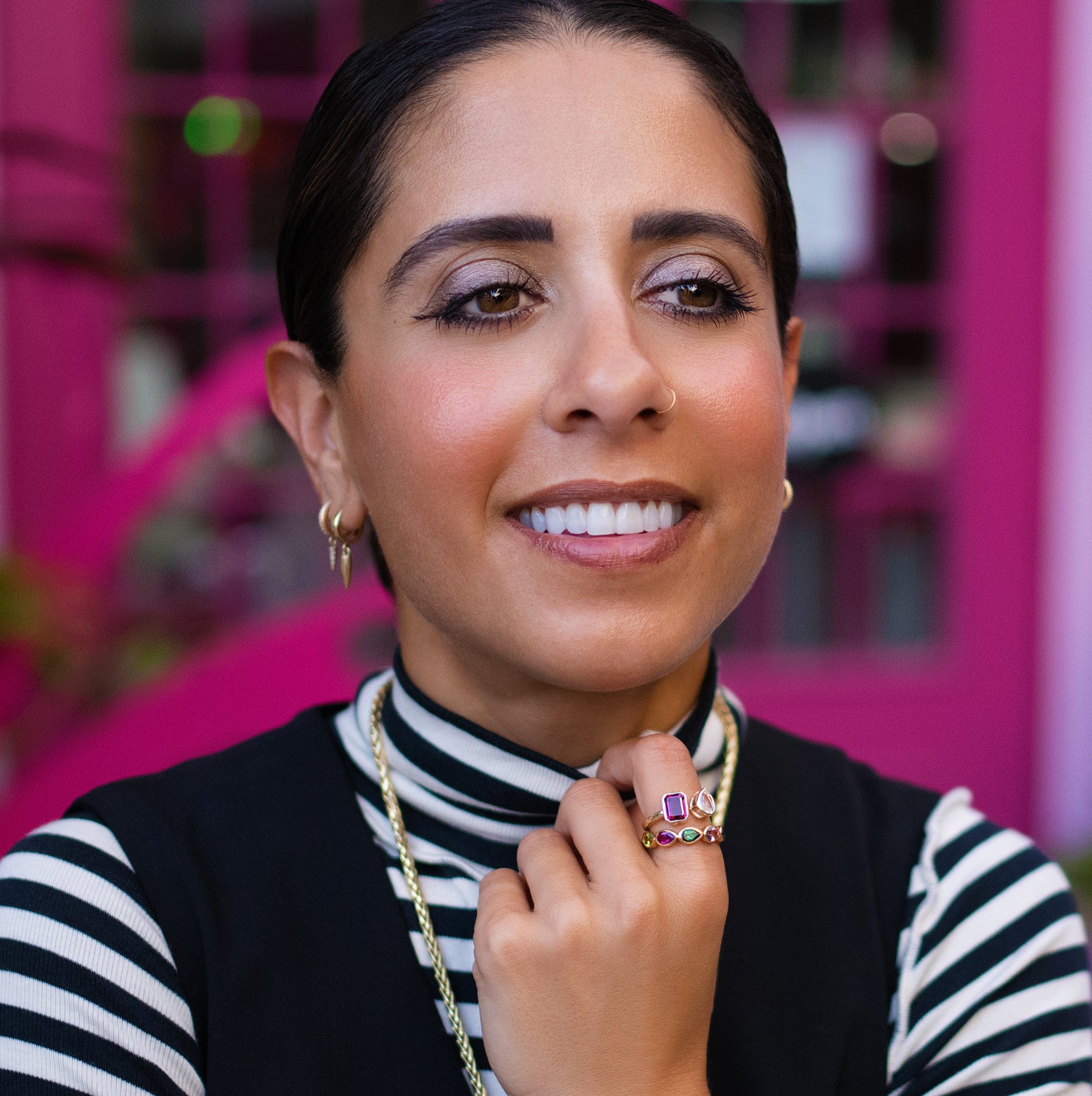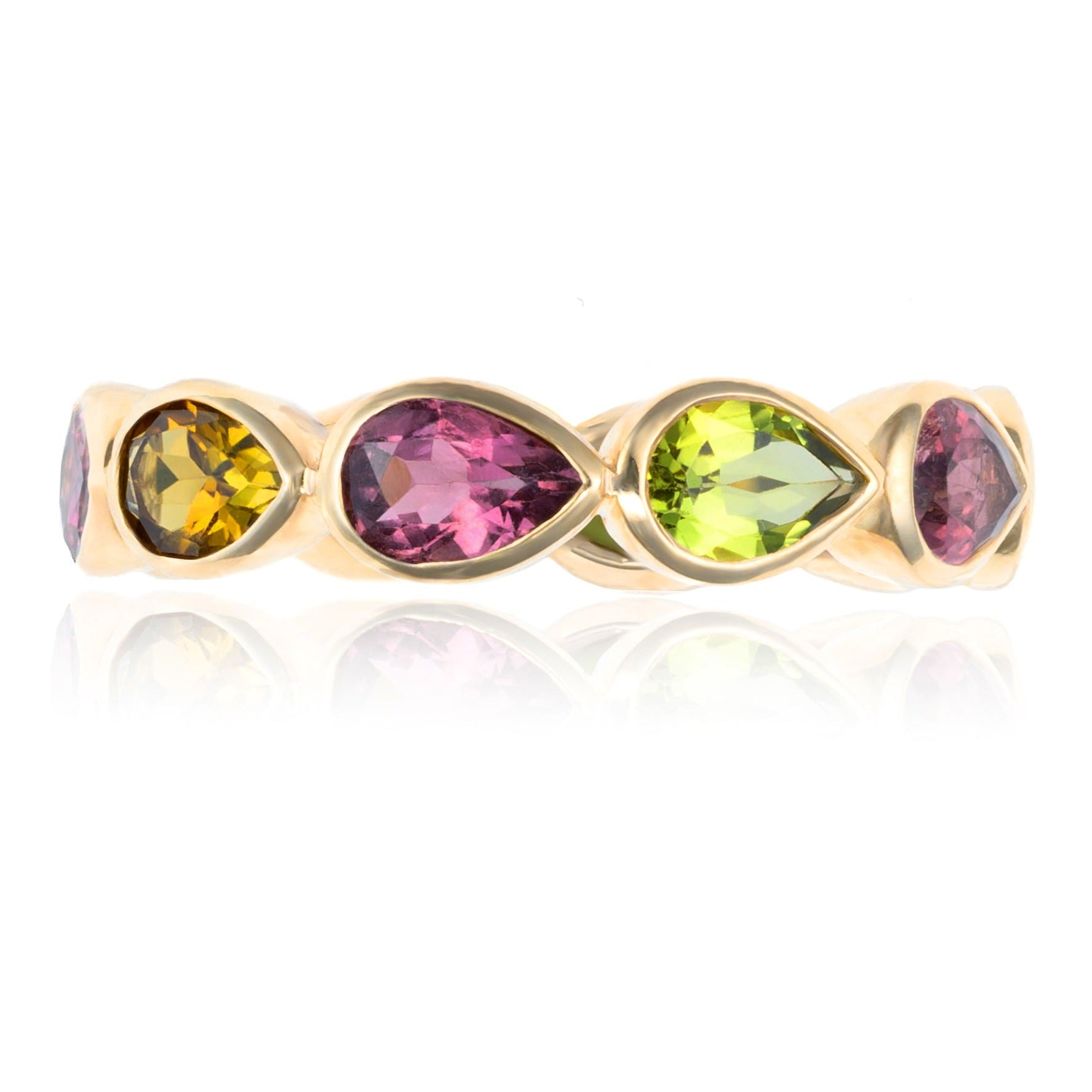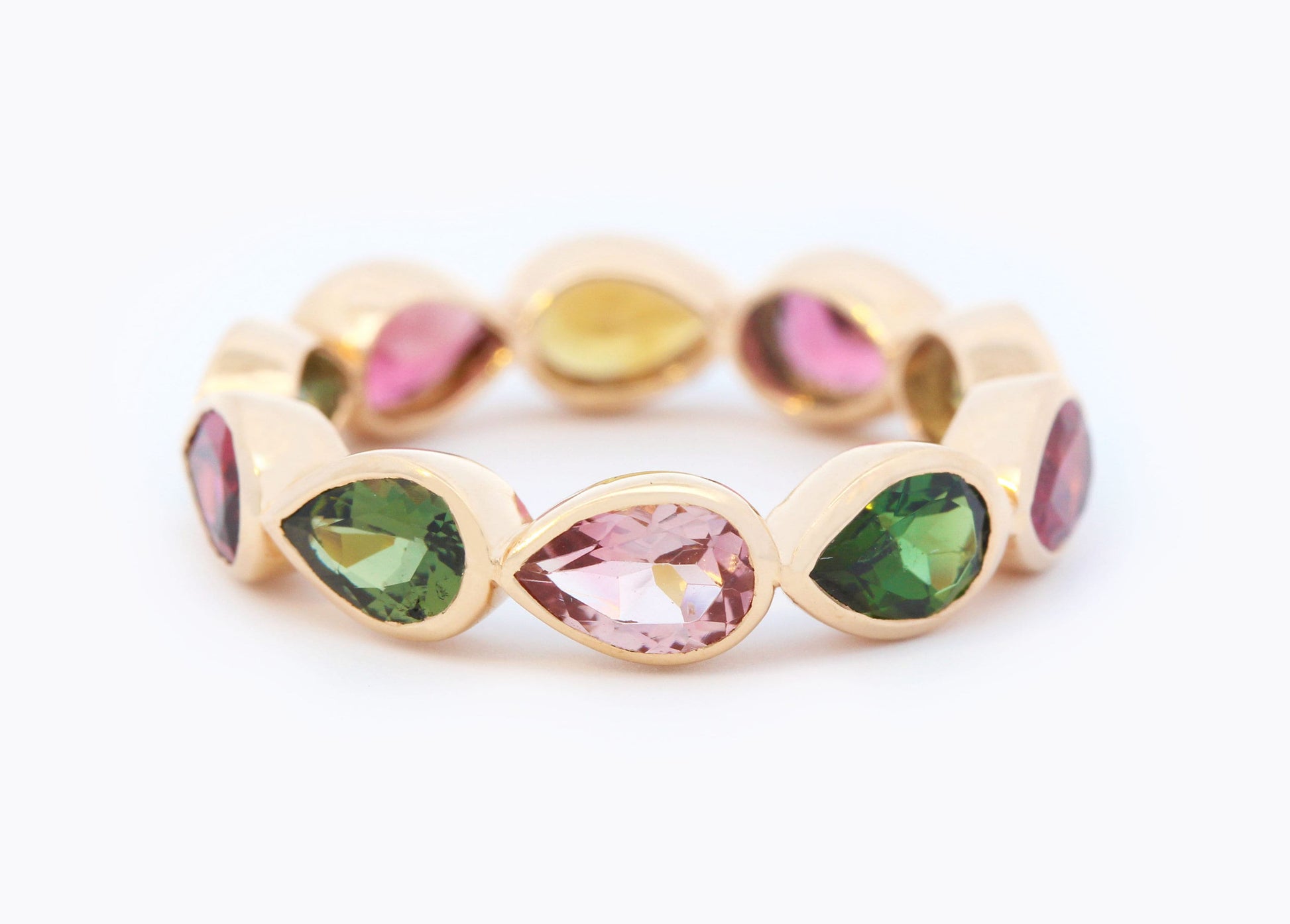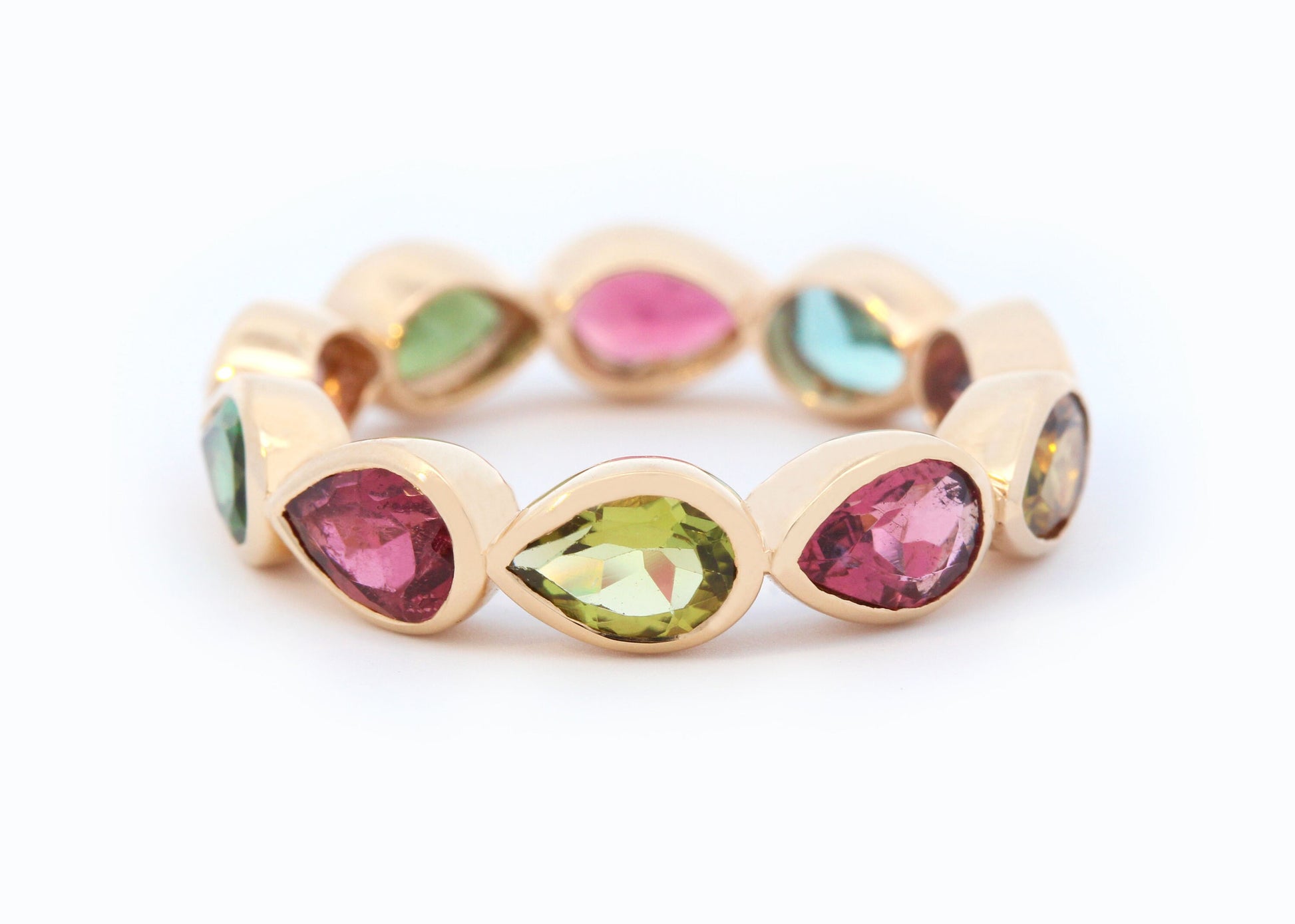 Where jaw dropping beauty meets ultimate comfort! You'll never want to take off this solid 18K yellow gold, bezel set, pear shaped, multi color, natural tourmaline ring eternity band. A stunning ring for your everyday!