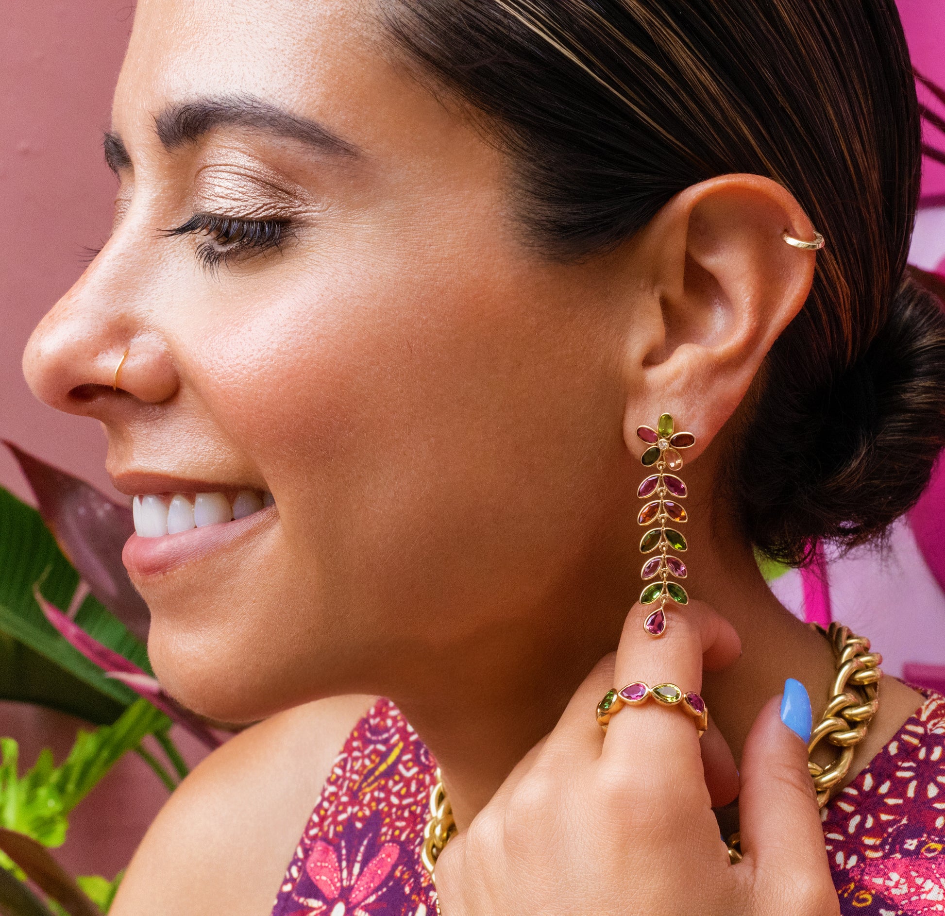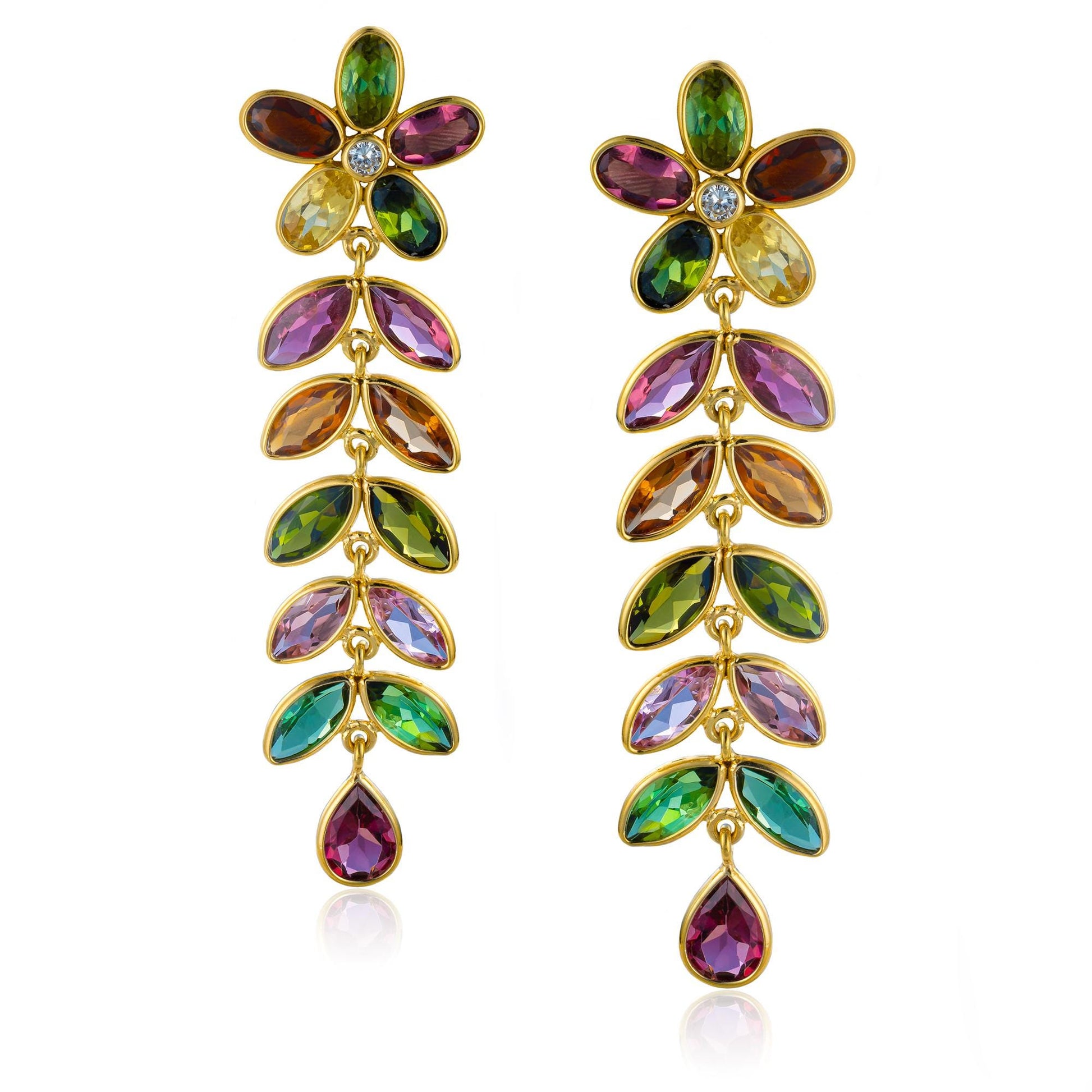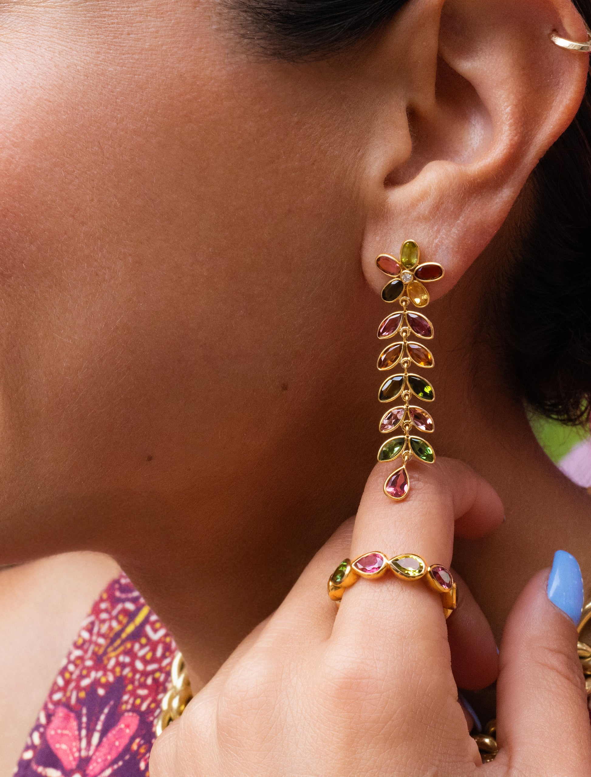 Multi Tourmaline Bezel Floral Drop Earrings in 14K Yellow Gold