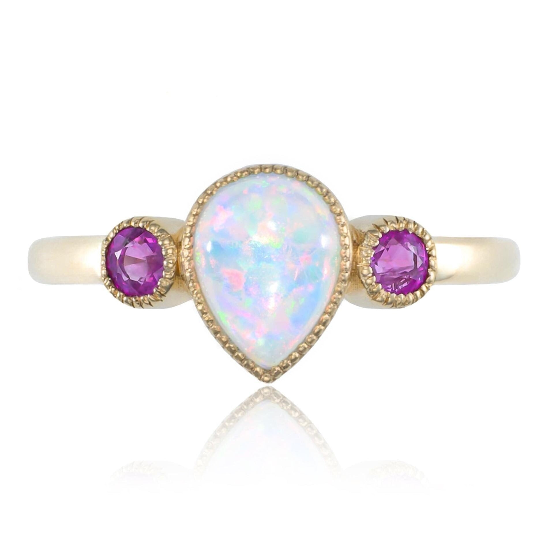 This gorgeous 14k gold ring features a mesmerizing natural, pear shaped Opal complemented perfectly by two natural, round Pink Sapphires. The bezels feature exquisite milgrain detail. The play-of-color in the Opal will take your breath away.