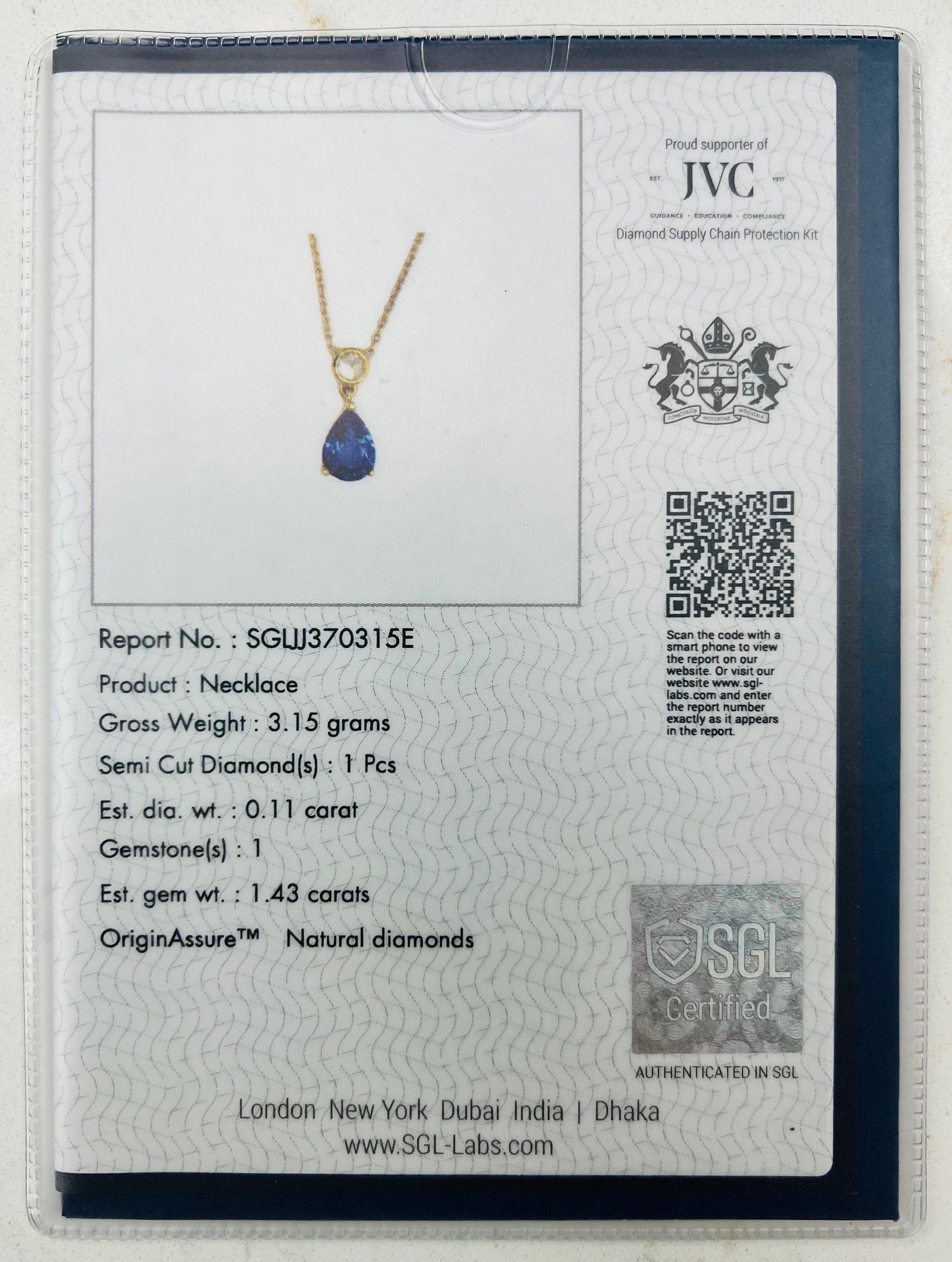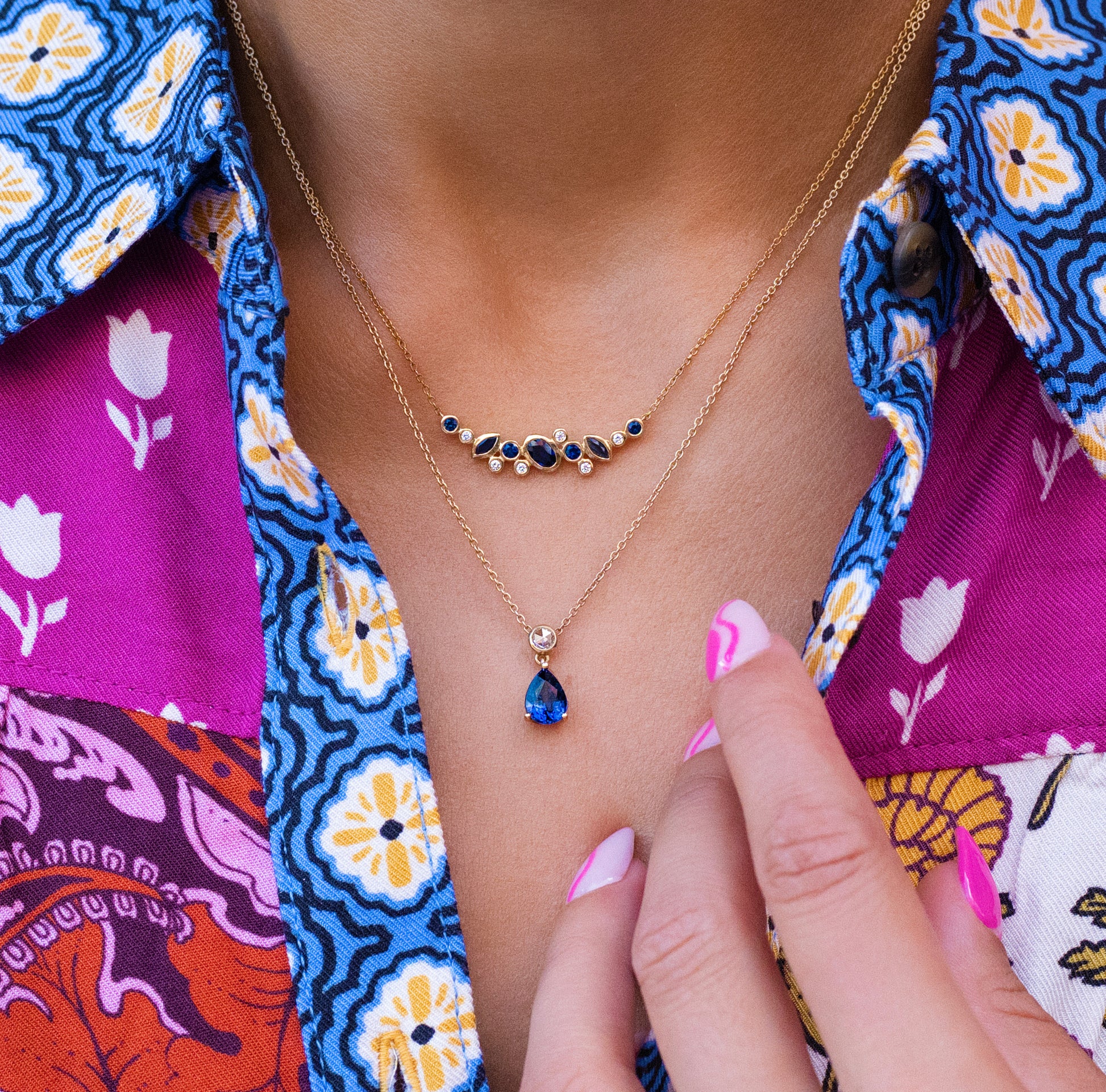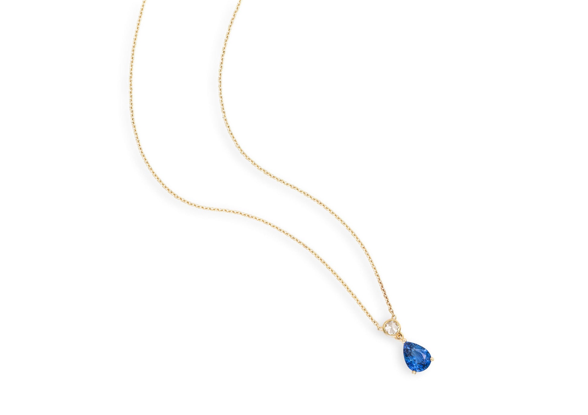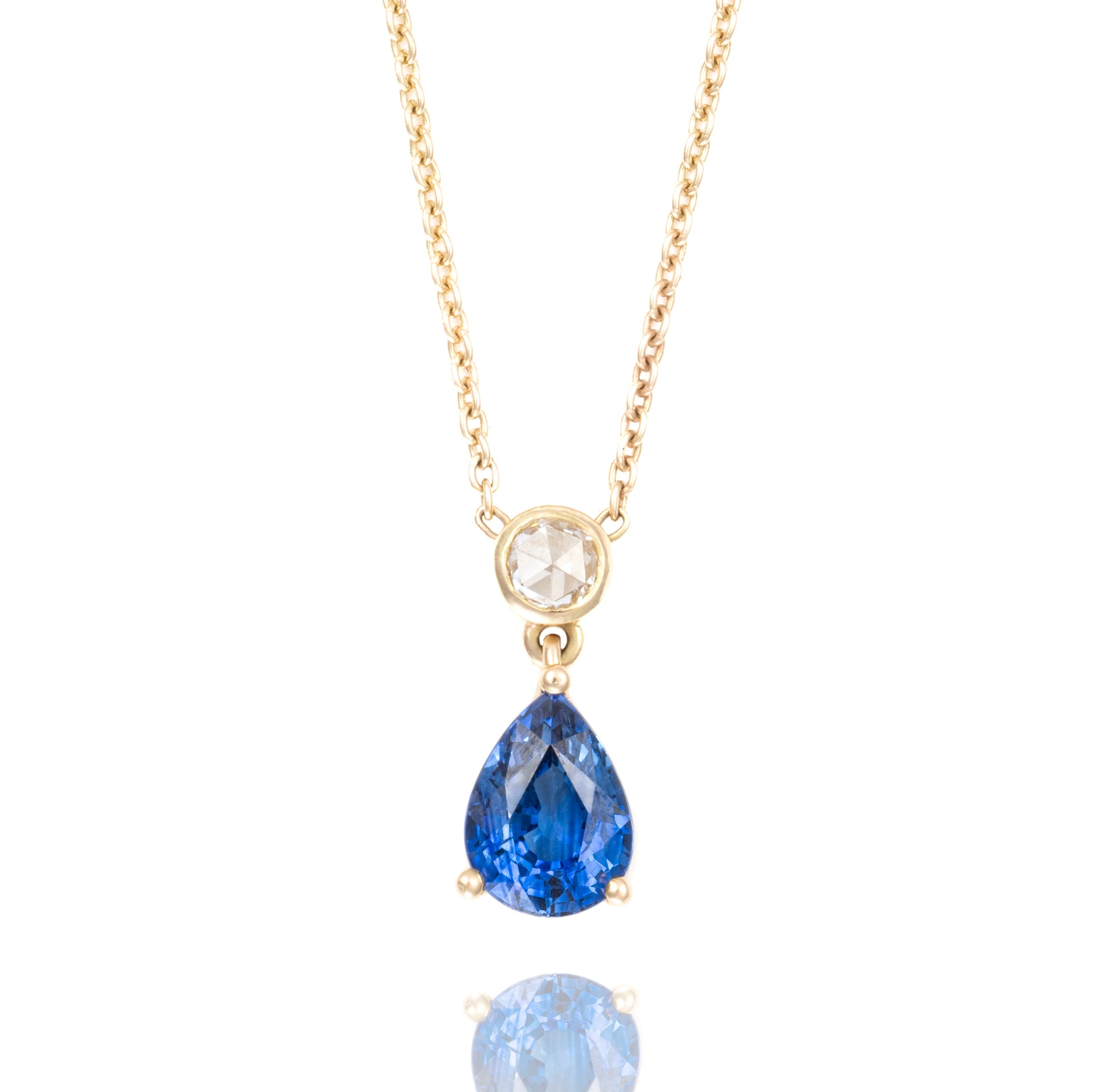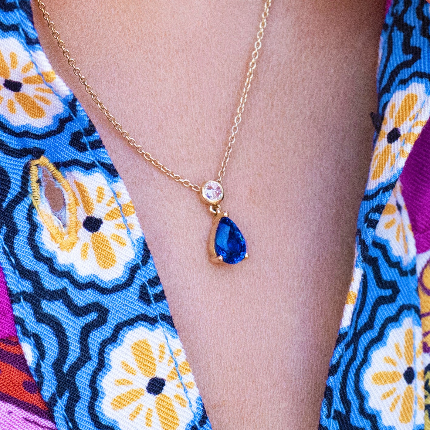 Pear Blue Sapphire and Rose Cut Diamond Pendant Necklace in 18K Yellow Gold