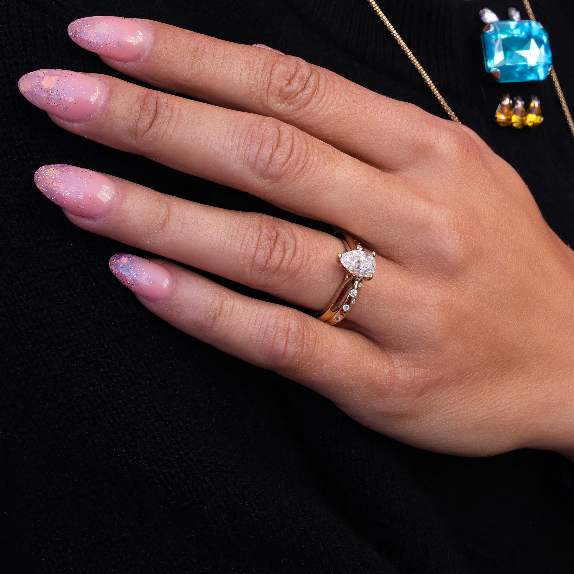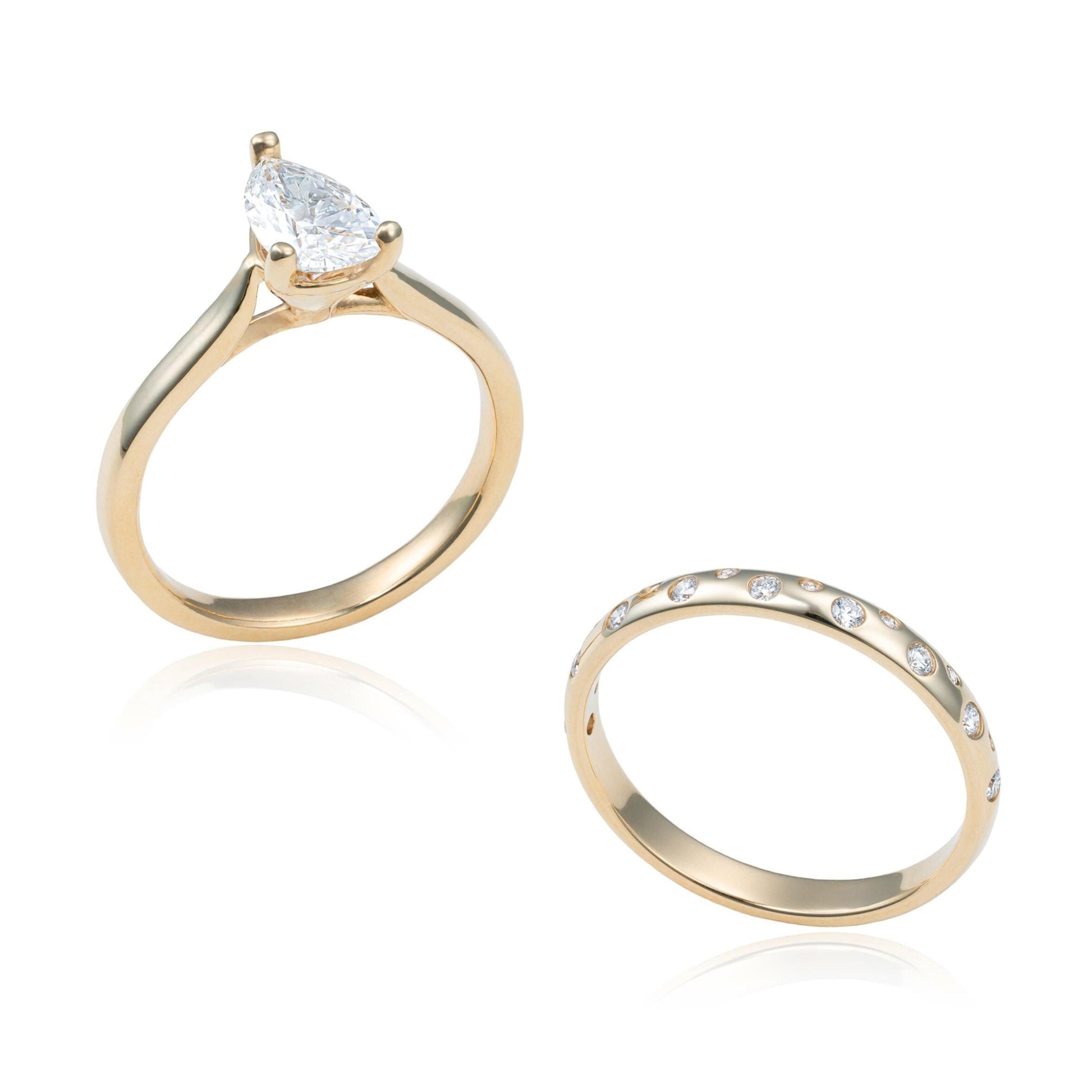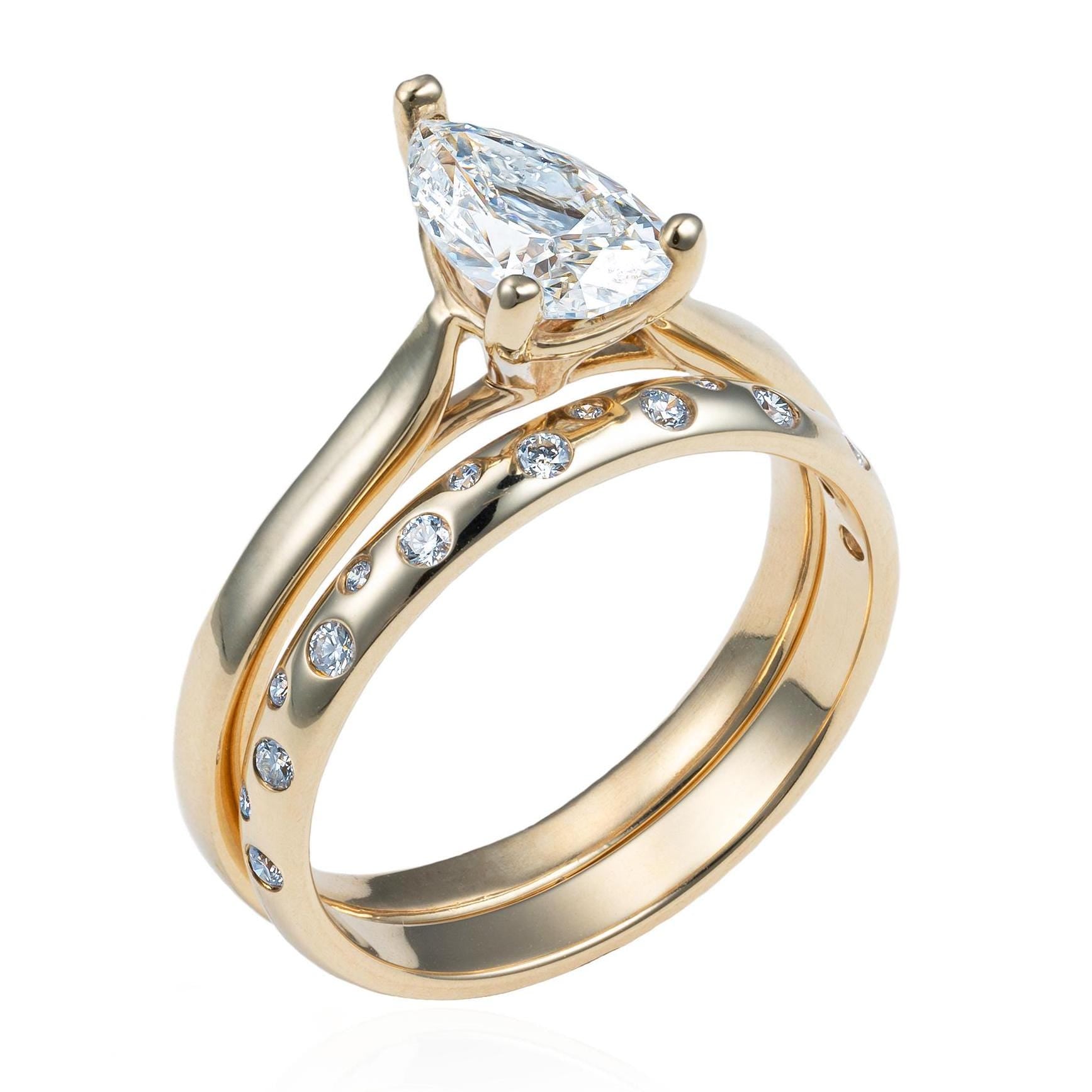 Pear Shaped Solitaire Diamond Wedding Set with Scattered Diamond Gypsy Band in 14K Yellow Gold