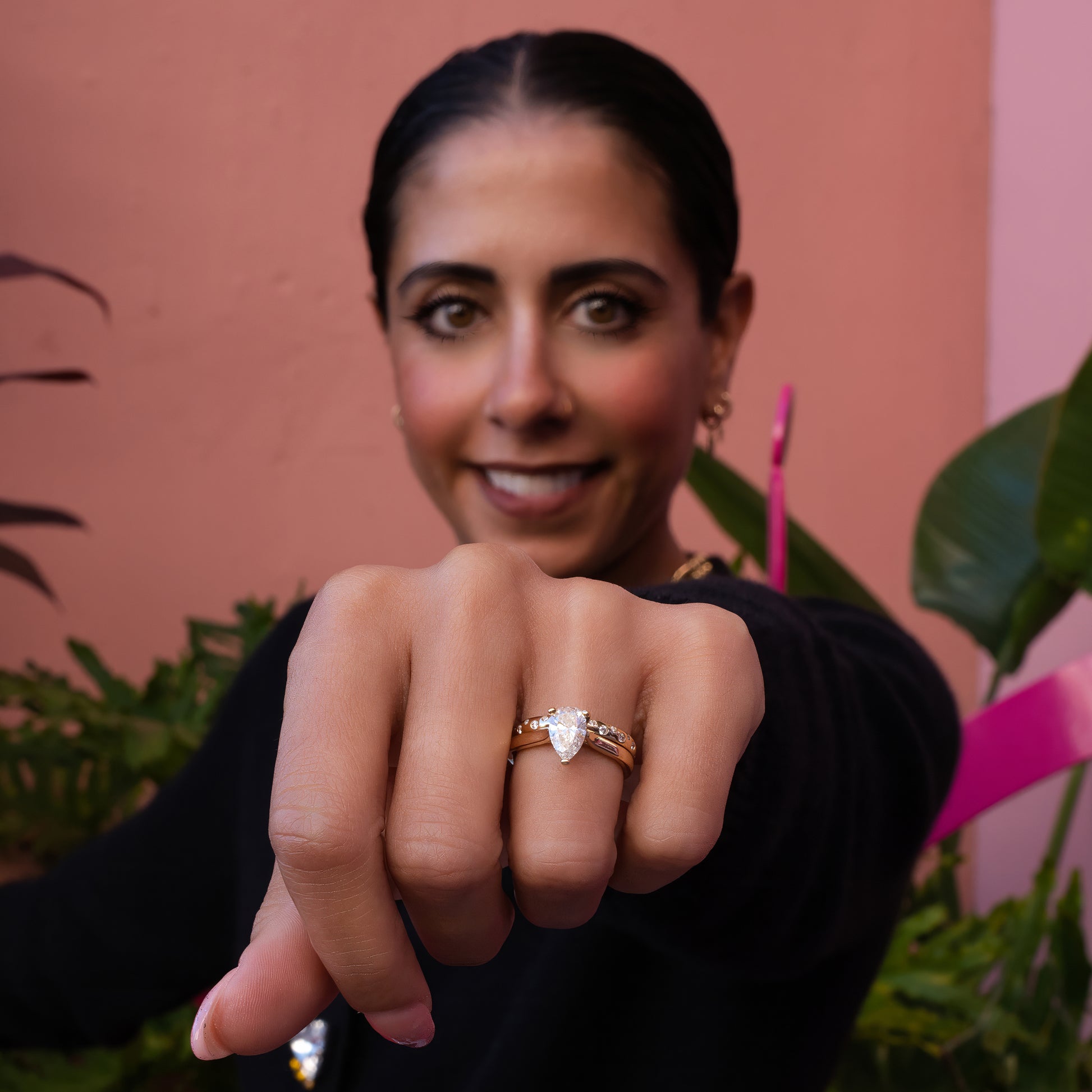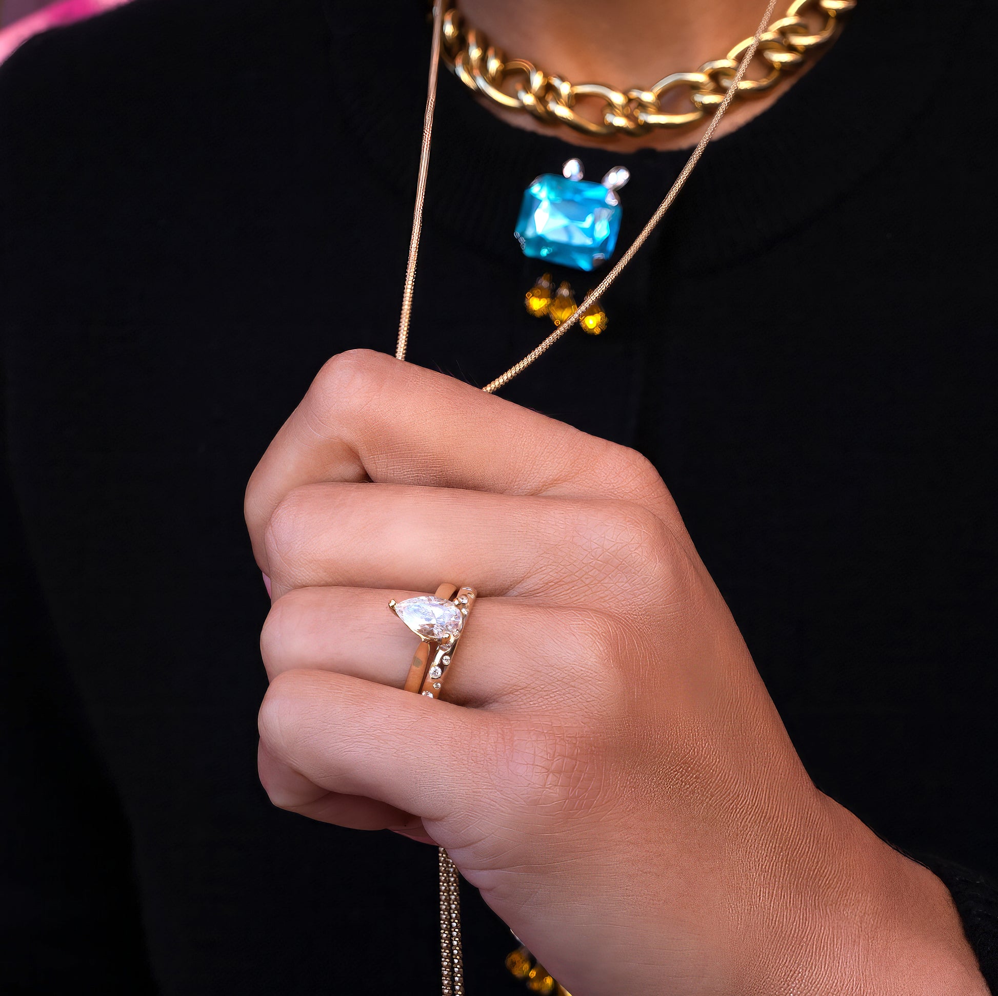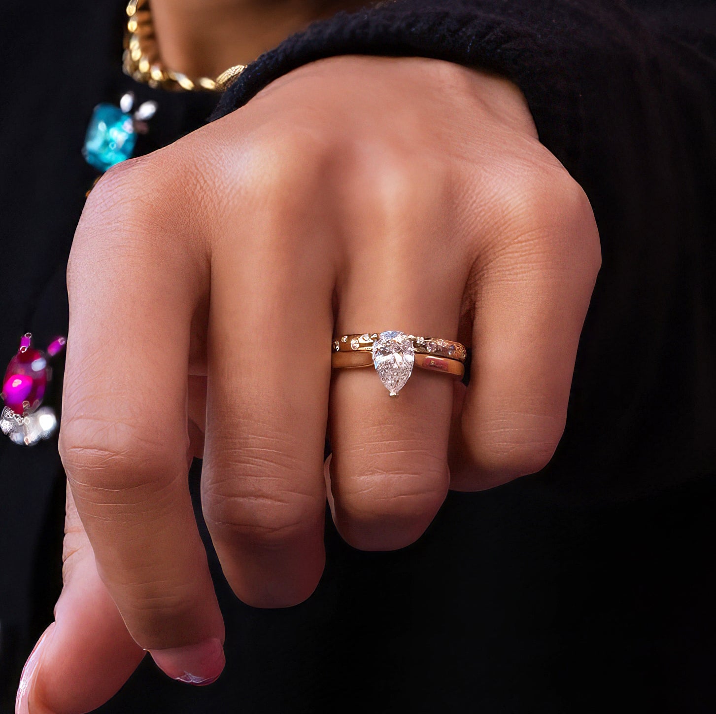 Pear Shaped Solitaire Diamond Wedding Set made in 14K Yellow Gold. This classic set has a modern twist with it‘s gorgeous, scattered Diamond wedding band. The chunkier band adds a unique touch. The scattered diamonds cover half of the band for durability and versatility when it comes to sizing.