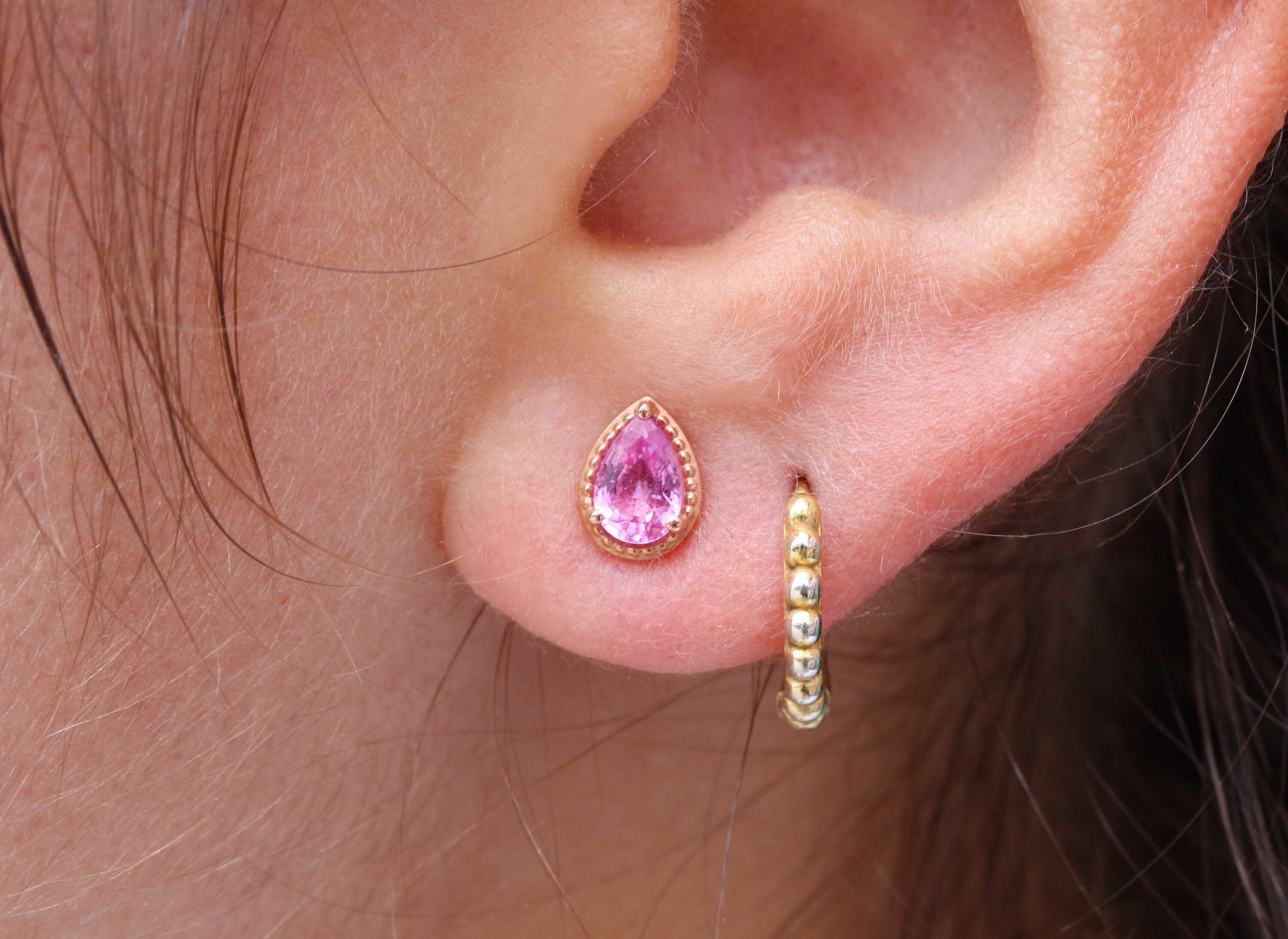 Absolutely gorgeous, NATURAL pear shaped pink sapphire stud earrings set in solid 14k rose gold with classic, milgrain bezels.