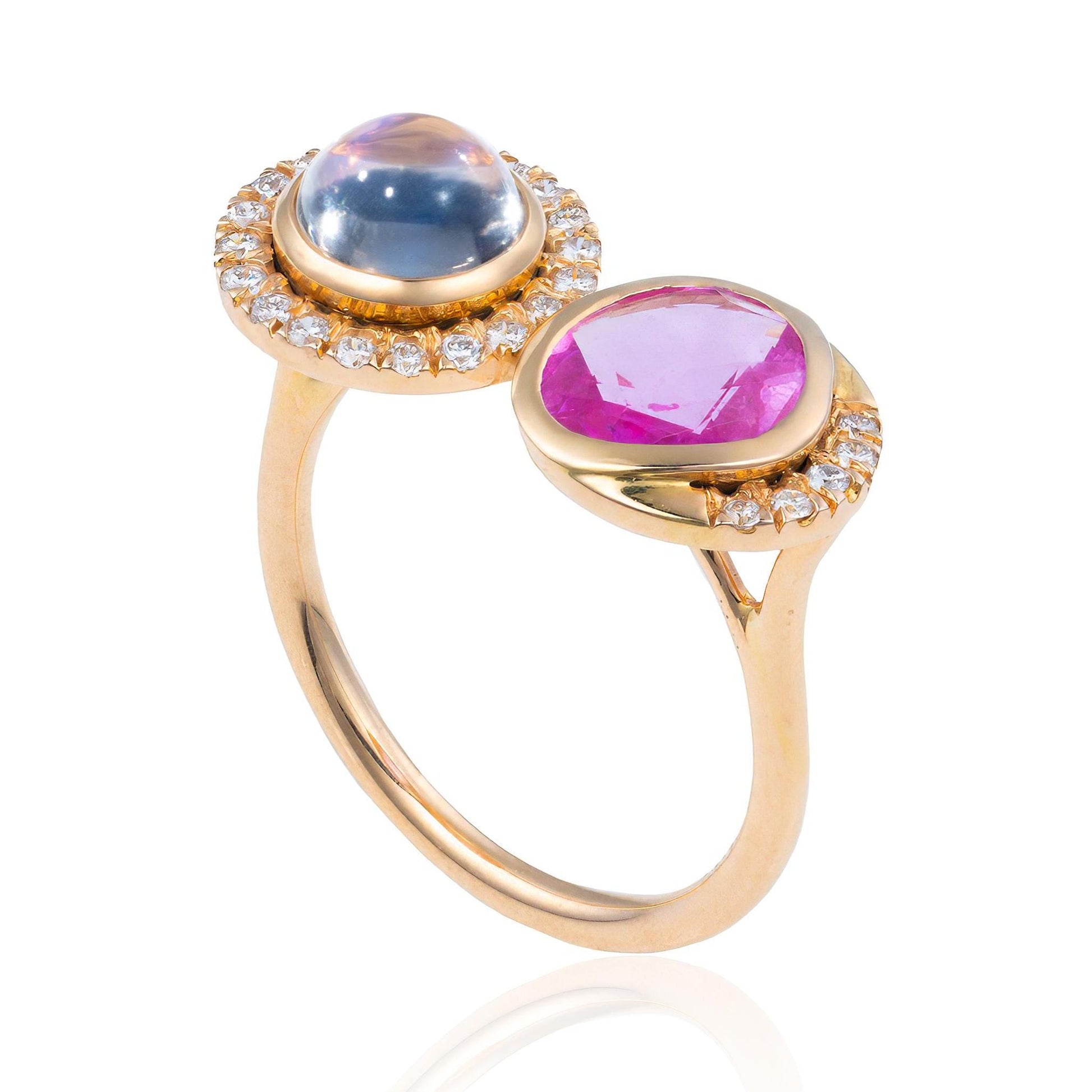 Pink Sapphire & Rainbow Moonstone with Diamond Accents Toi et Moi Ring in 18K Gold