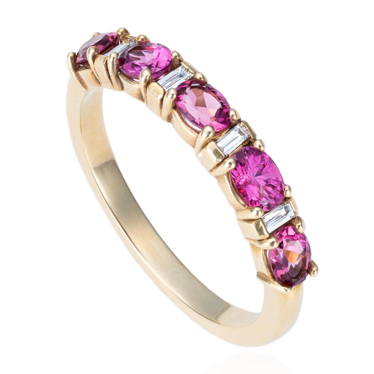 Pink Tourmaline & Diamond Stackable Band made in 14K Yellow Gold. This versatile band features approximately 1.0 CTW. of oval shaped Pink Tourmaline and approximately .06 of natural Diamond baguettes.