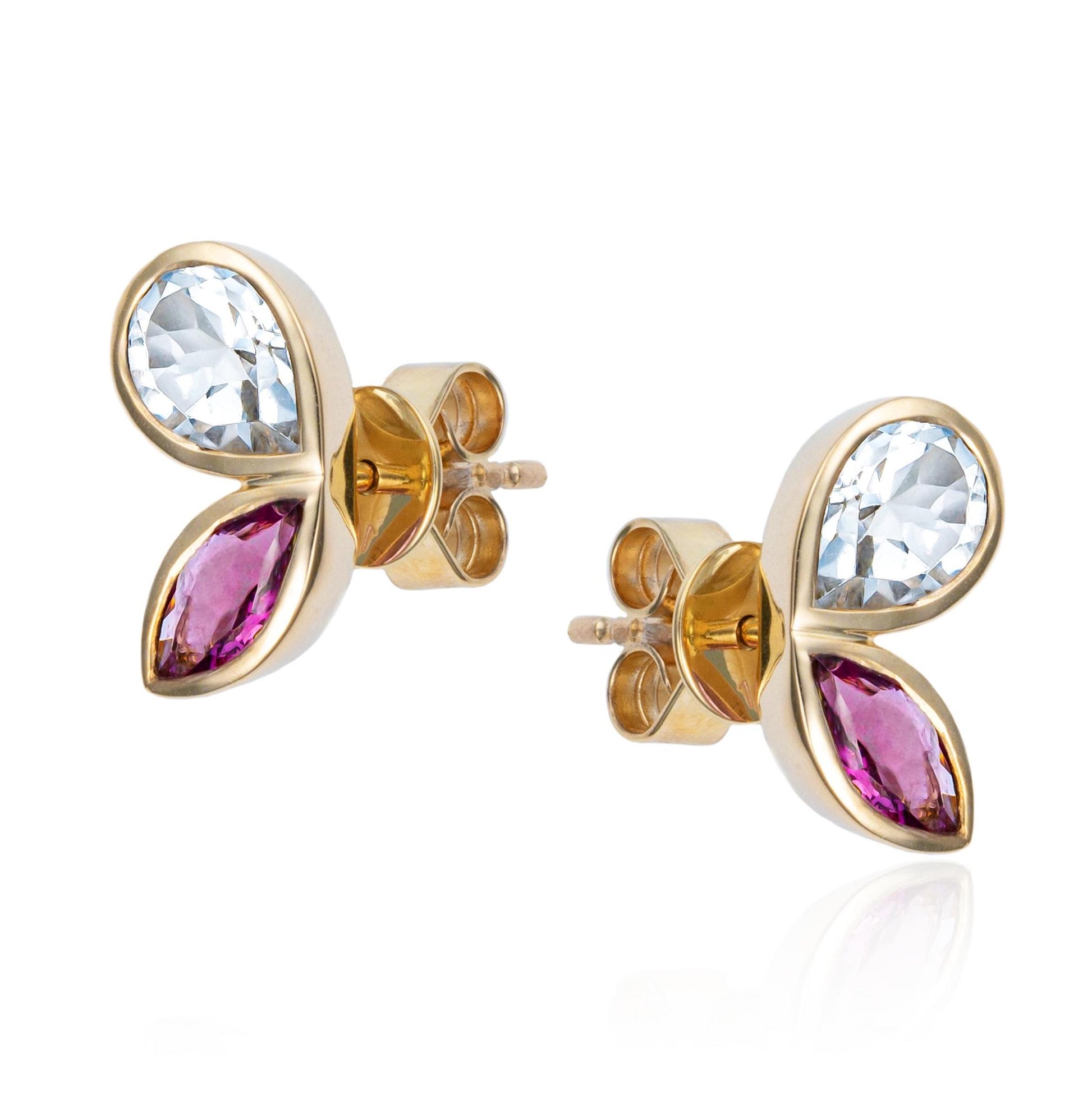 Pink Tourmaline & White Topaz Duo Bezel Stud Earrings in 14K Yellow Gold