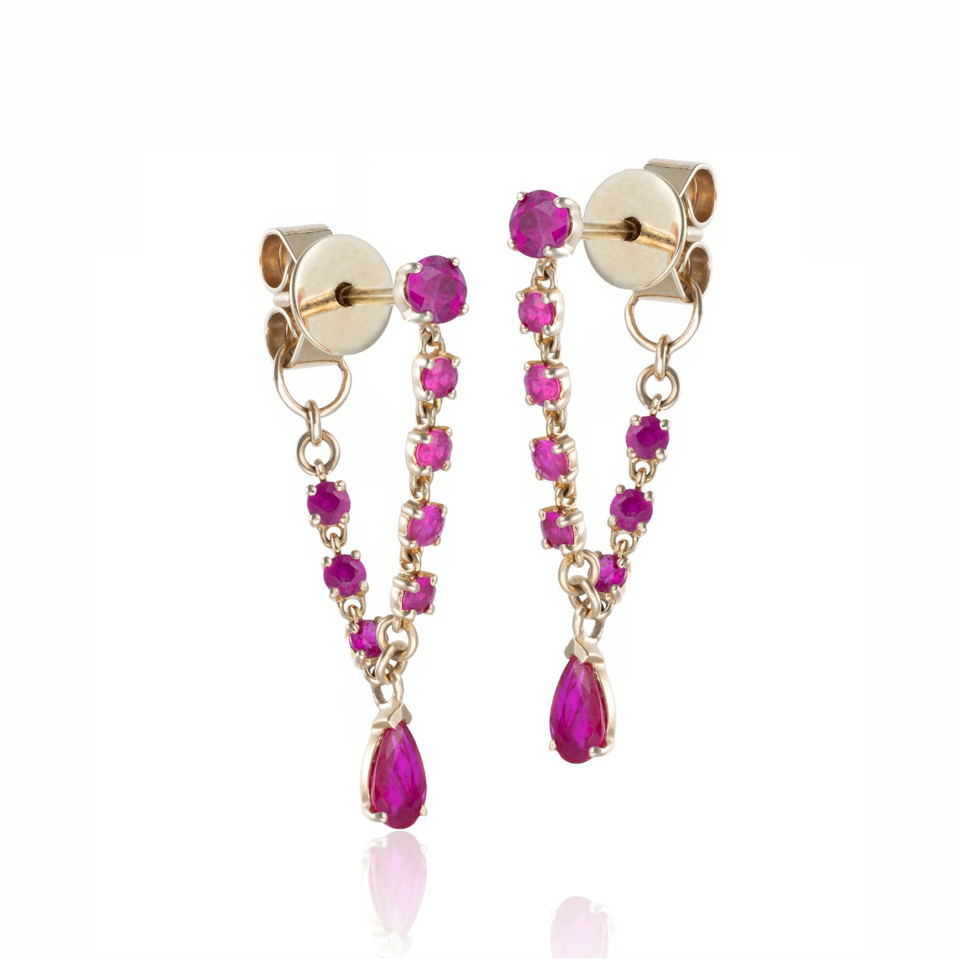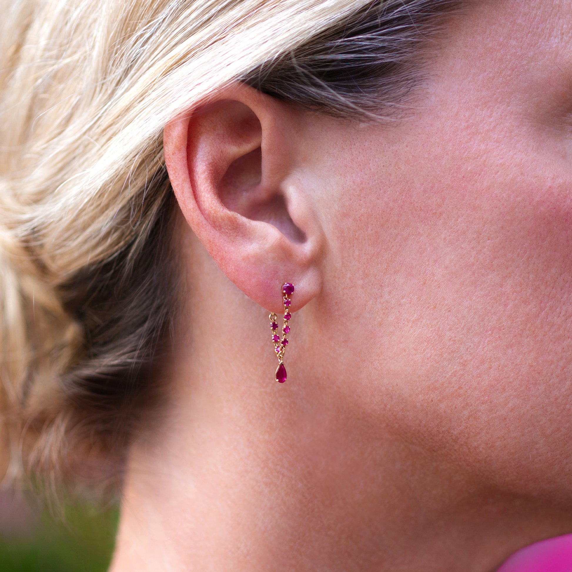 These beautiful Ruby Chain Drop Huggies crafted 14K Yellow Gold is will add a delicate, feminine touch to any ensemble. The unique nature of these earrings won't go unnoticed. 1.12 CTW of natural Rubies are set on both the inside out outside of the chain. You won't loose the backs because they're attached!