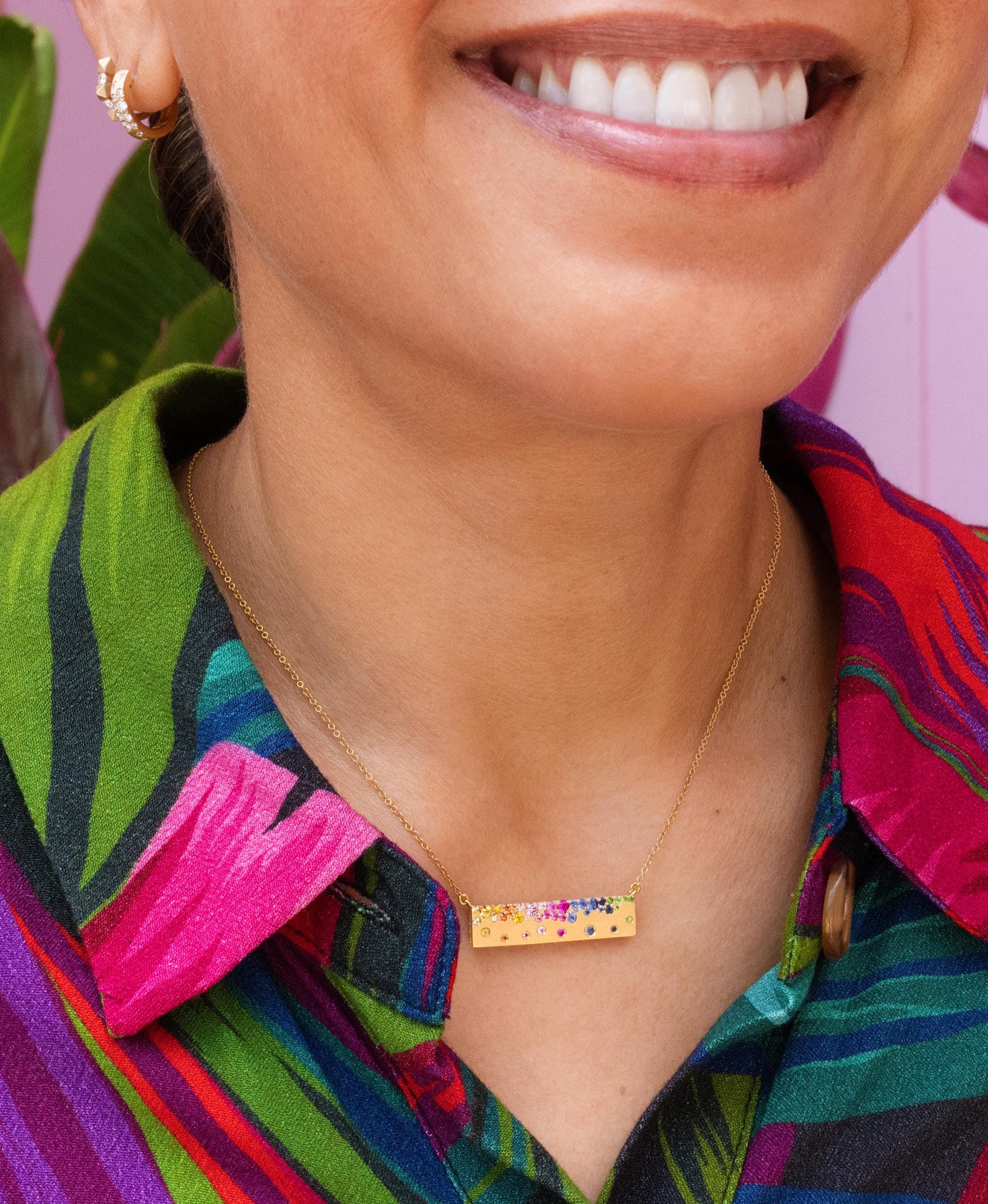 Scattered Rainbow Sapphire Bar Necklace made in 14K Yellow Gold. This vibrant necklace features .77 CTW. of vivid, natural, multi-colored sapphires. The green stones are Tsavorite Garnets! The solid gold bar showcases a gorgeous satin finish. The necklace adjusts between 16 and 18 inches.