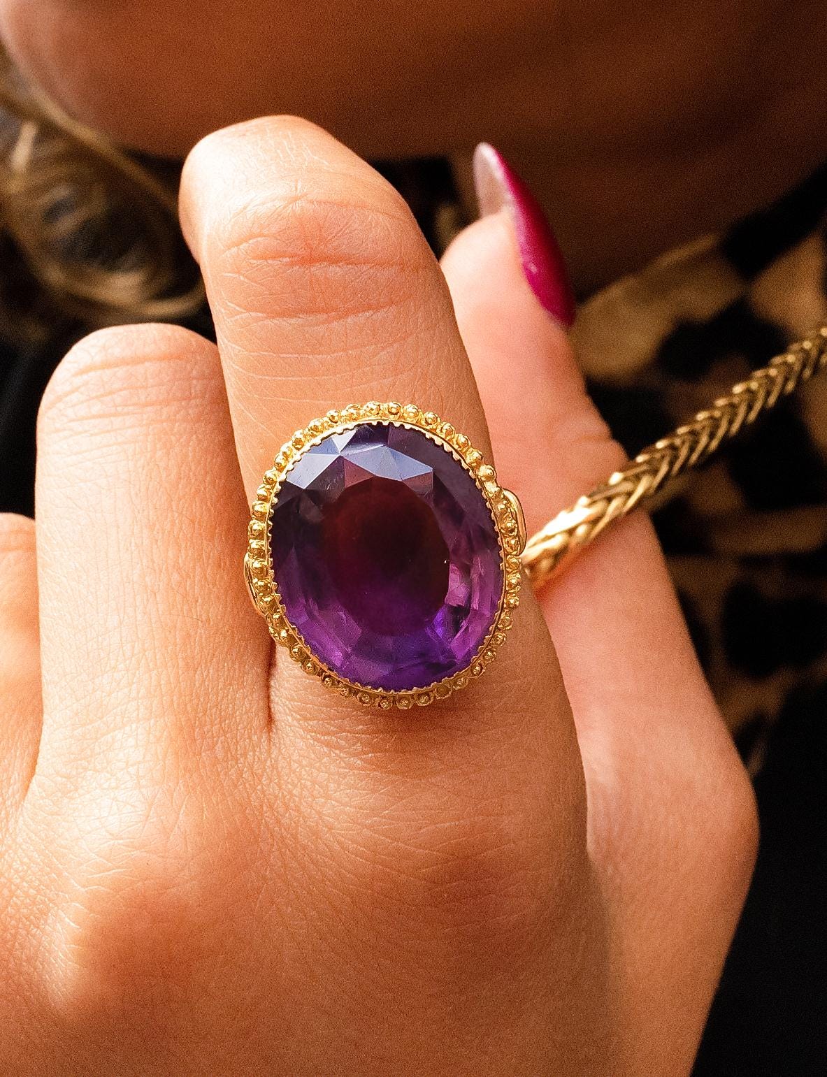 Victorian Amethyst Milgrain Bezel Ring made in 14K Yellow Gold. This breathtaking antique features an oval mixed cut Amethyst measuring approximately 19 x 16 mm set in a beaded wire bezel with knotted shoulders. This ring is both solid and heavy.