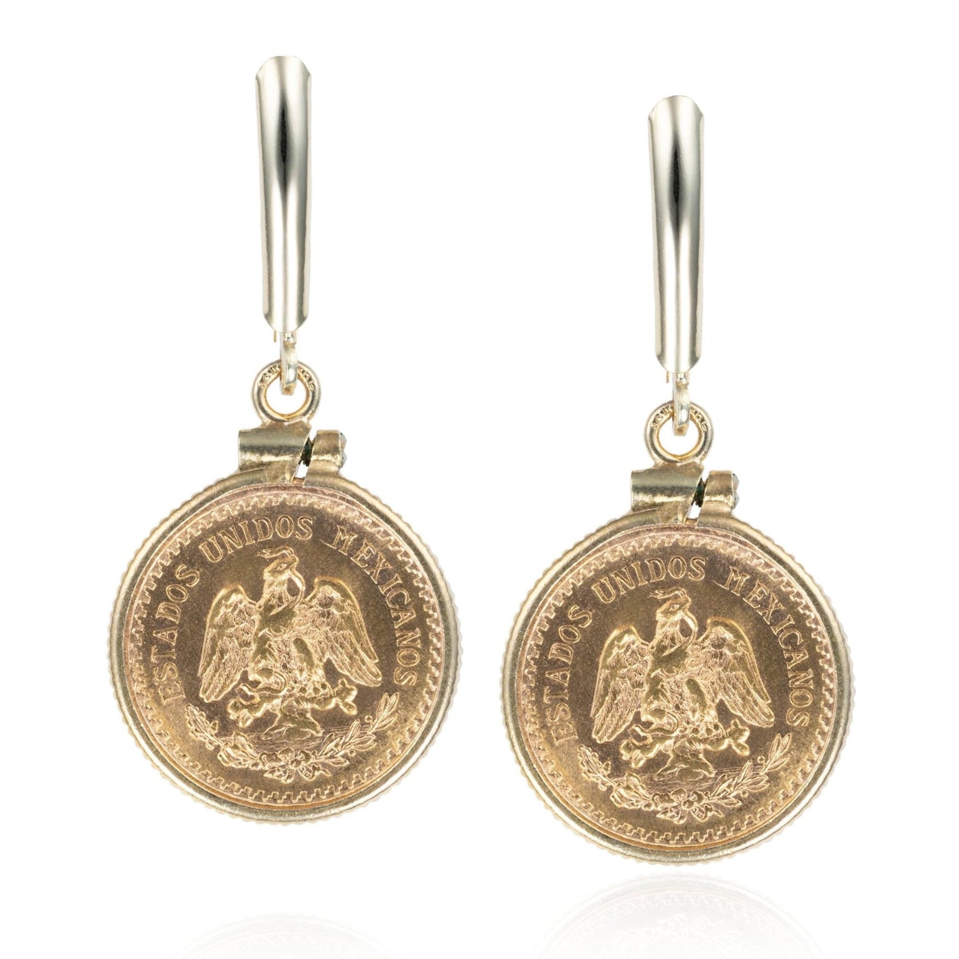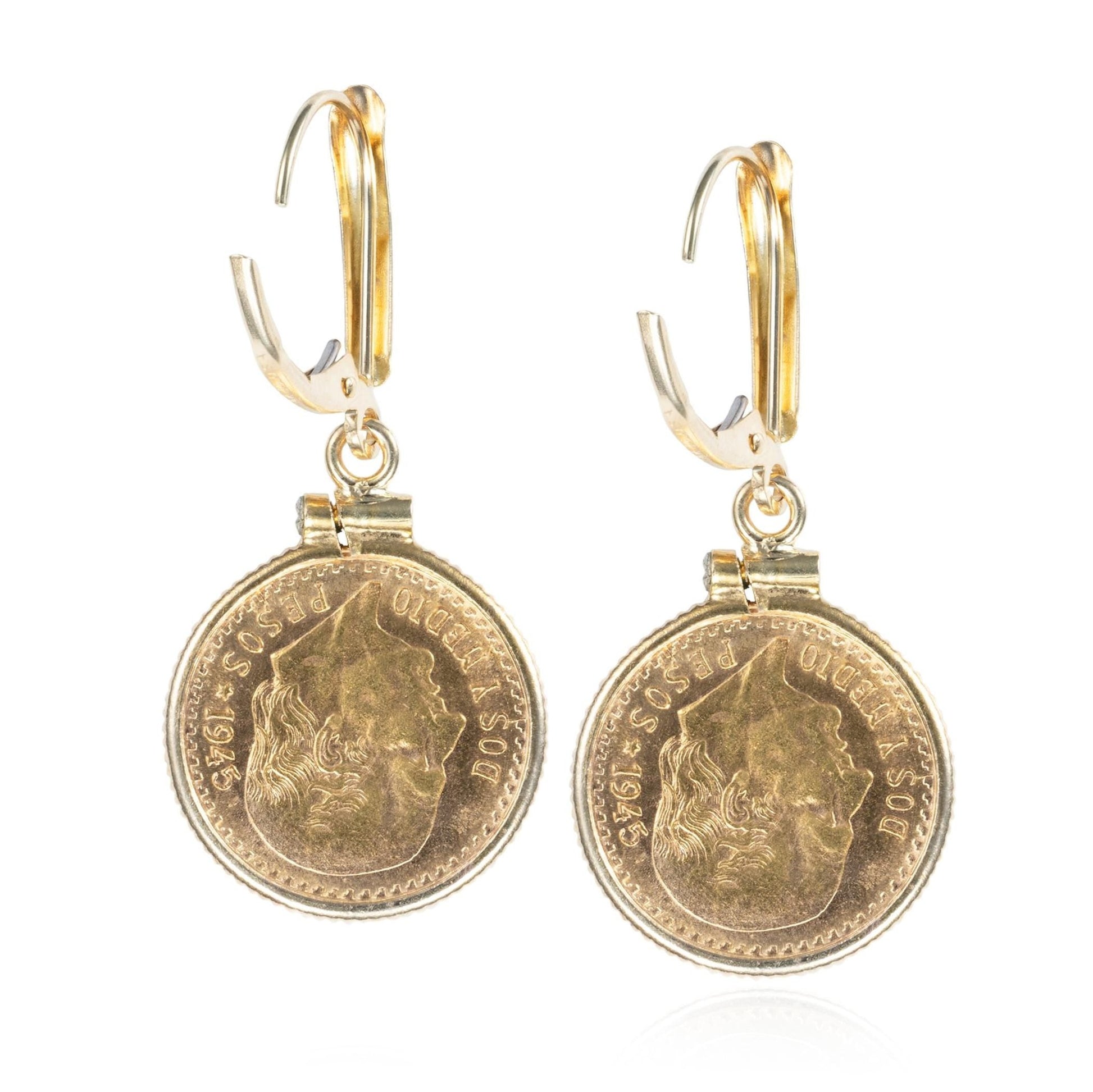 The 2.5 Pesos gold coins from the Mexican Mint features the Mexican coat of arms. The text reads ESTADOS UNIDOS MEXICANOS and DOS Y MEDIO PESO 1945. These earrings have comfortable lever-back closures.