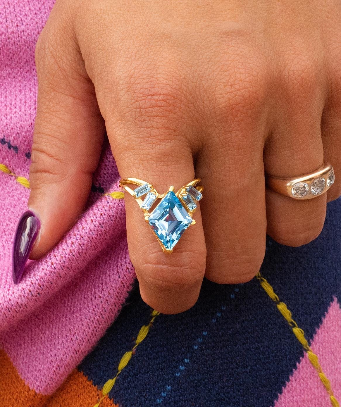 VINTAGE Blue Topaz Chevron Ring made in 14K Yellow Gold. This ring features vivid Blue Topaz set in solid 14K Gold. The unique shape looks great on the finger. Stack it for an even bolder look.