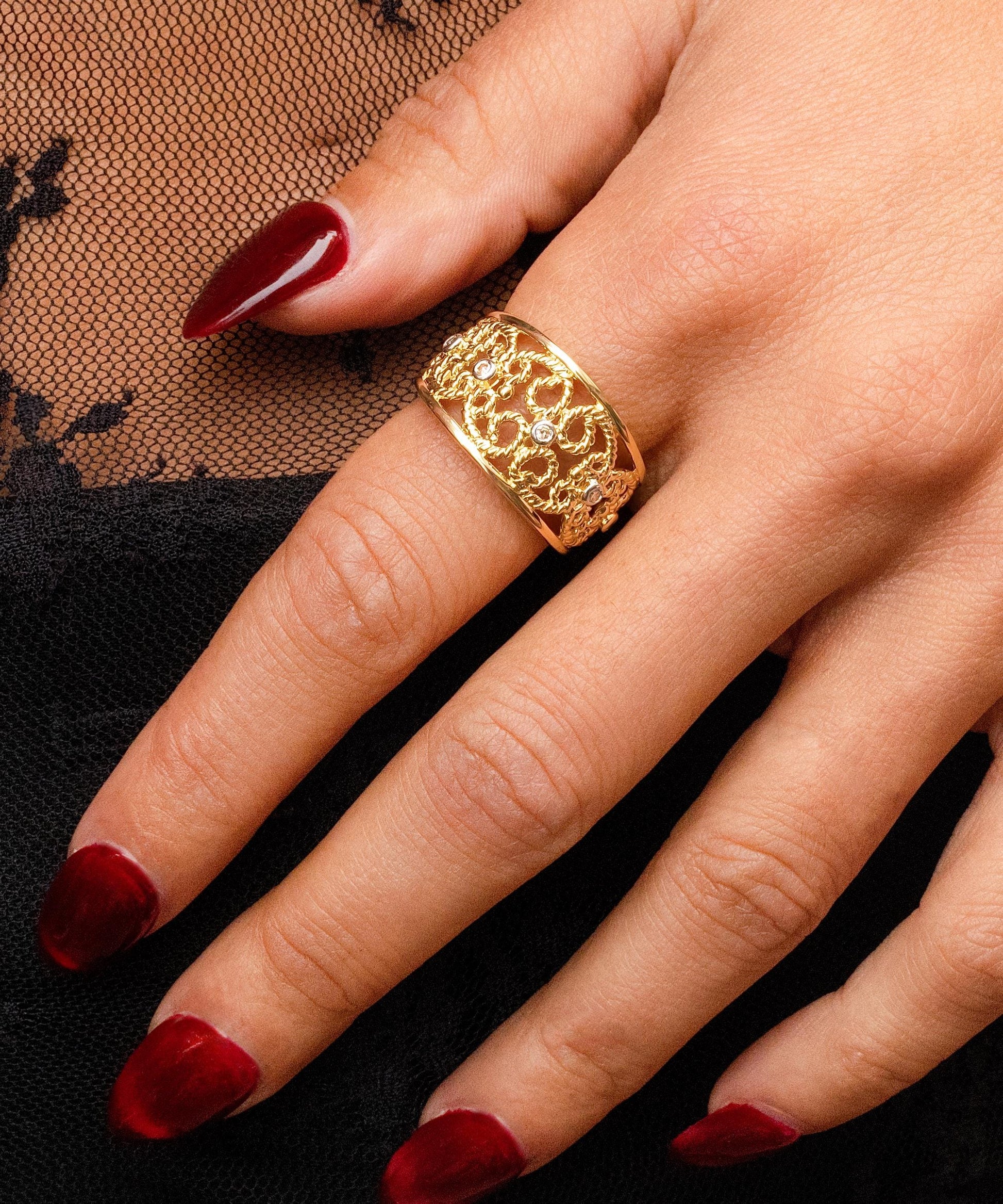 Filigree Wide Band with Diamond Accents in 14K Yellow Gold