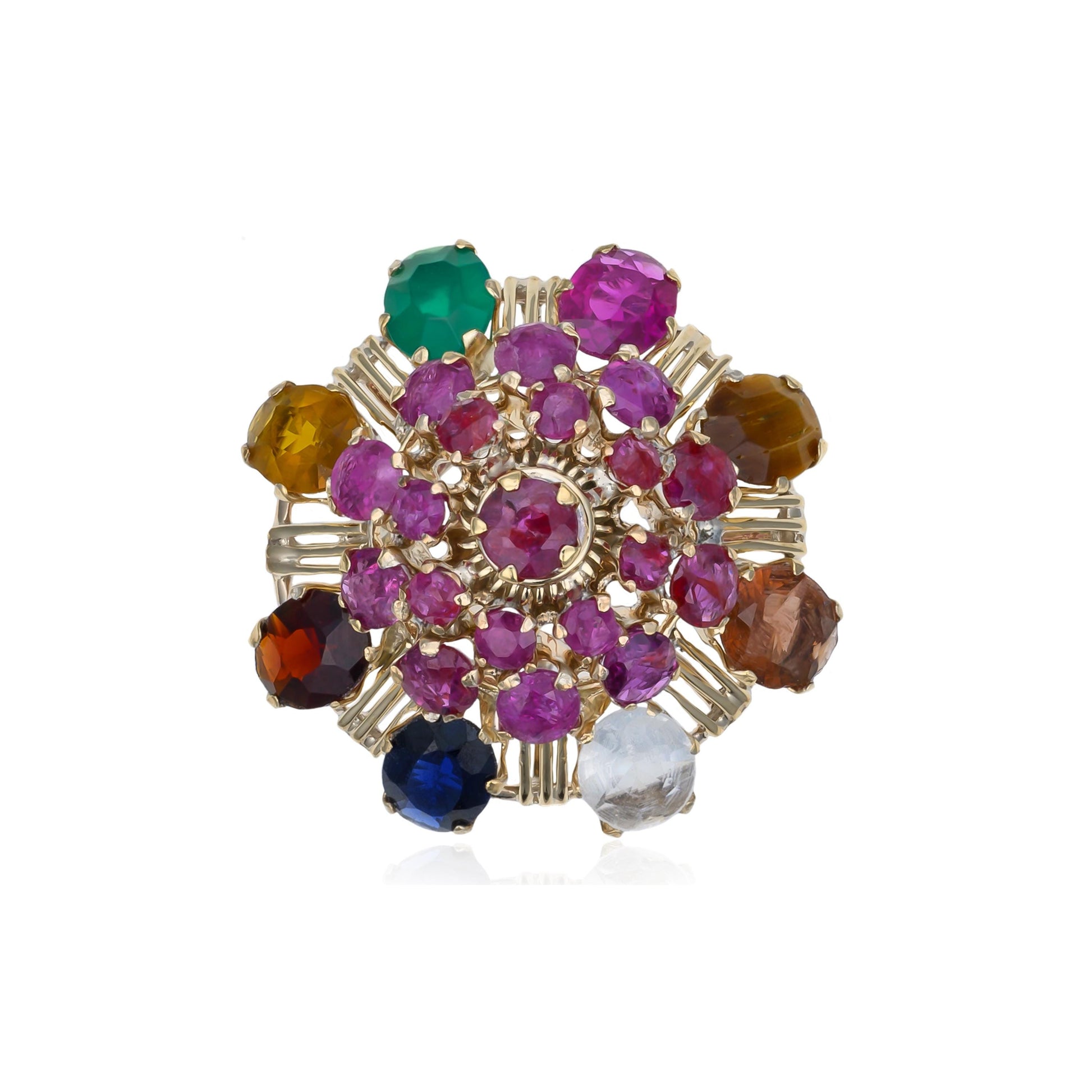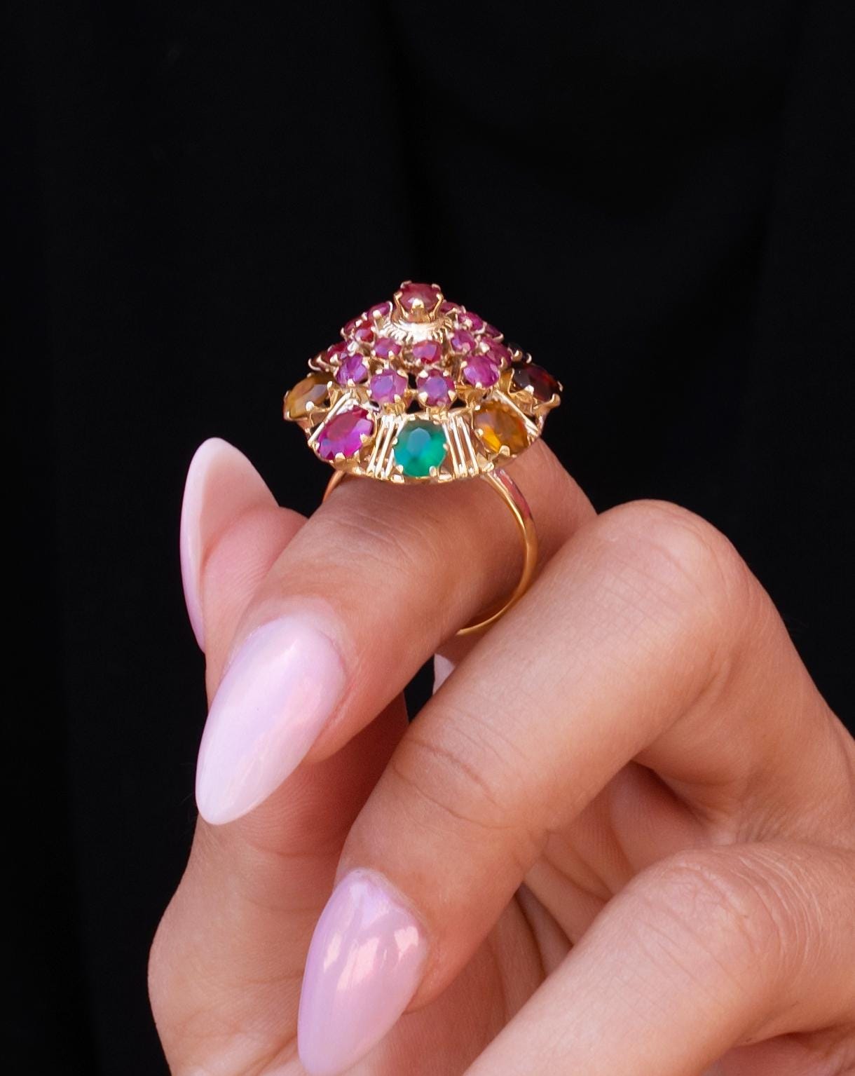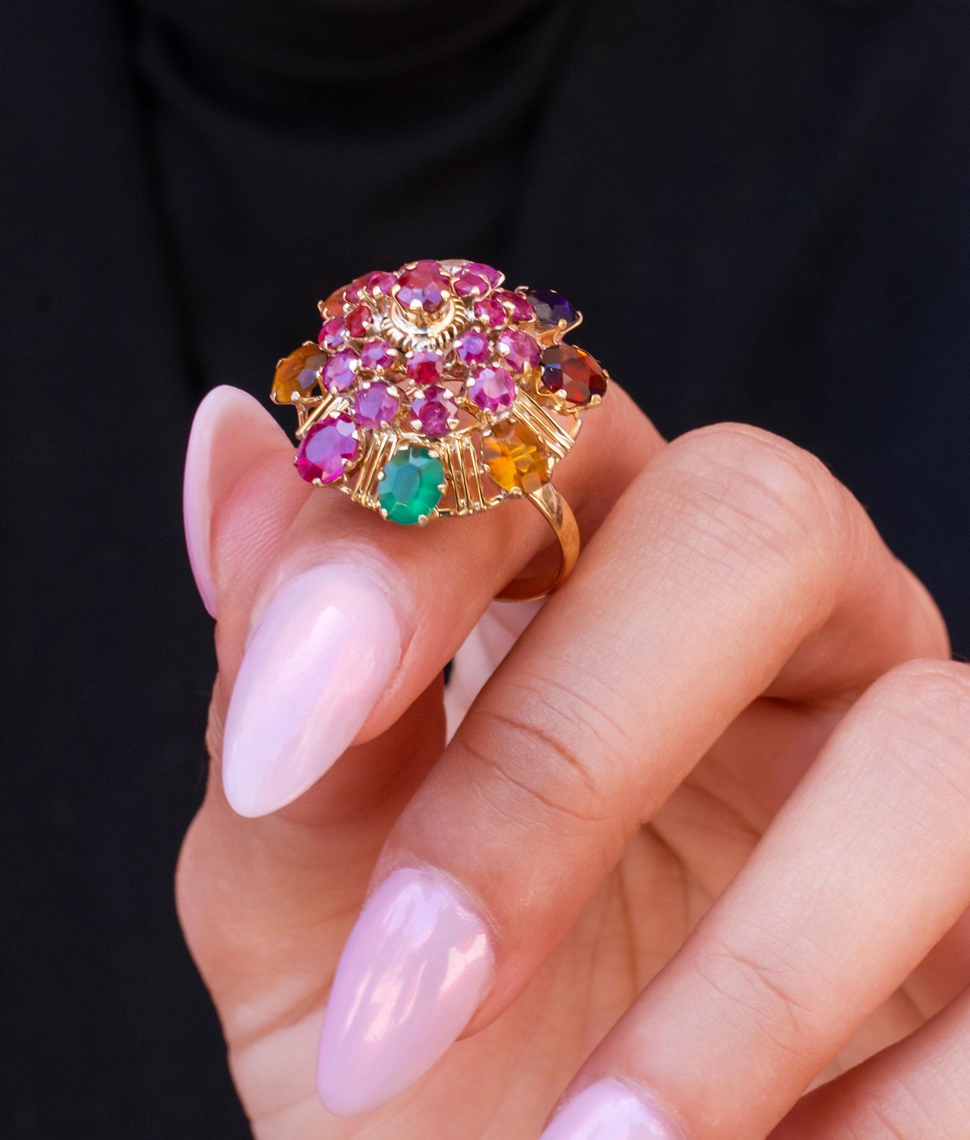 This ring features rubies, a sapphire, an emerald, a garnet, and an agate set in a strikingly eye catching domed design with intricate wire work.